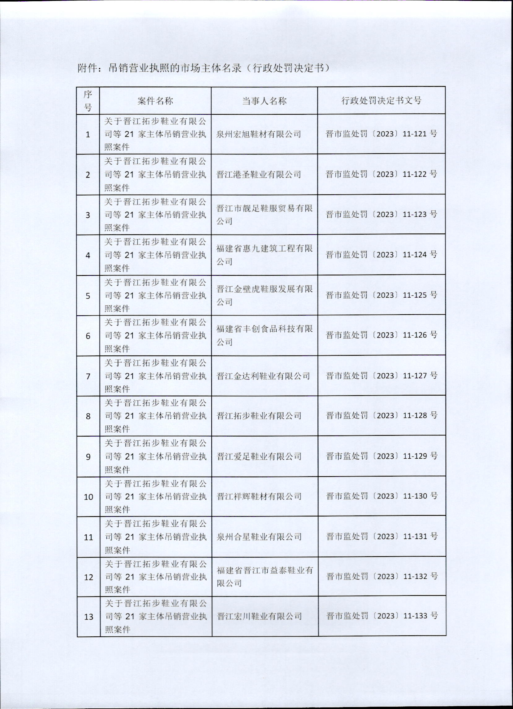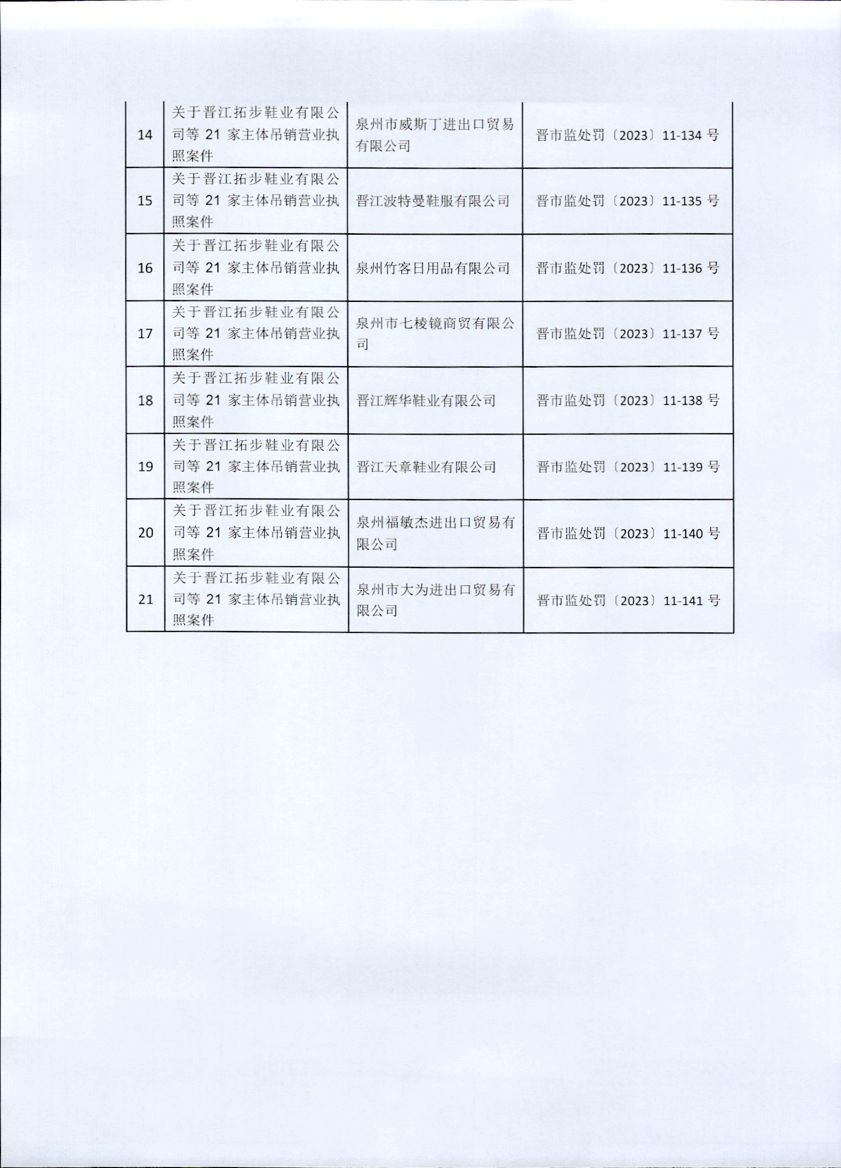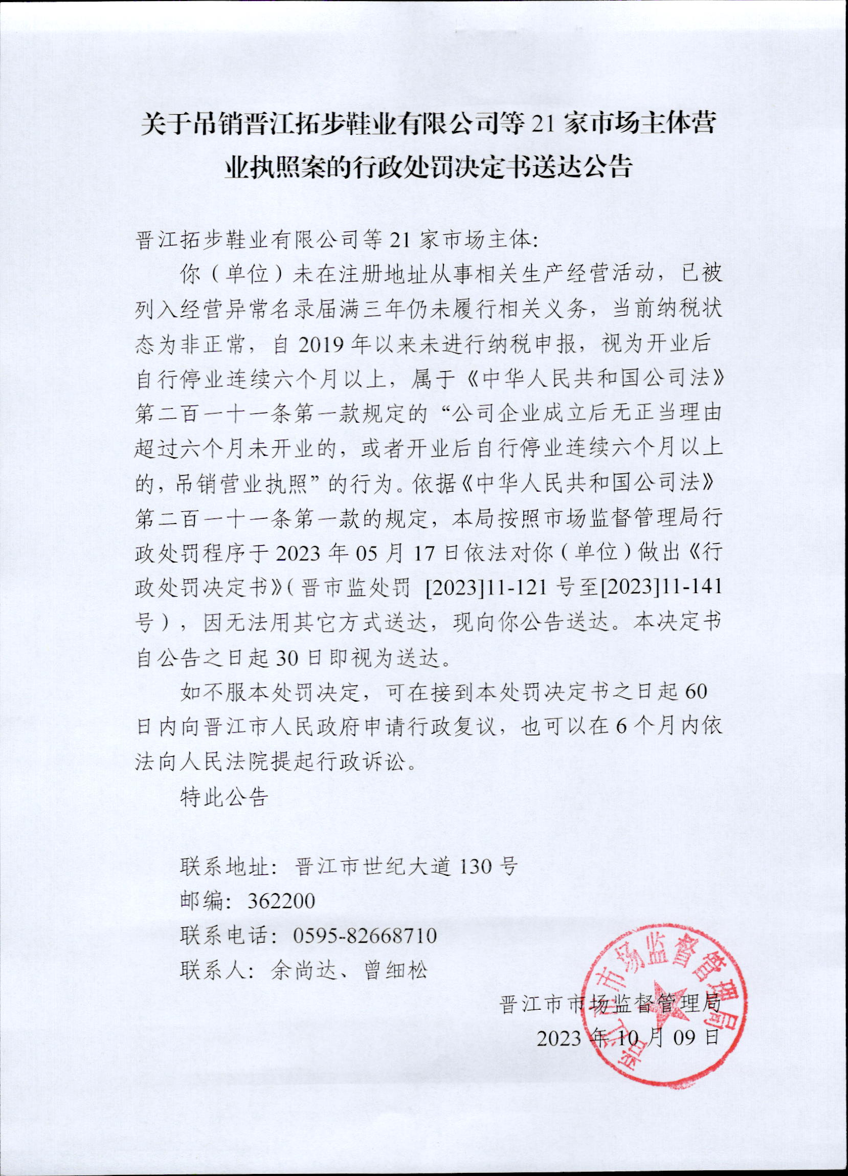 晋江市市场监督管理局关于吊销晋江拓步鞋业有限公司等21家市场主体营业执照案的行政处罚决定书送达公告