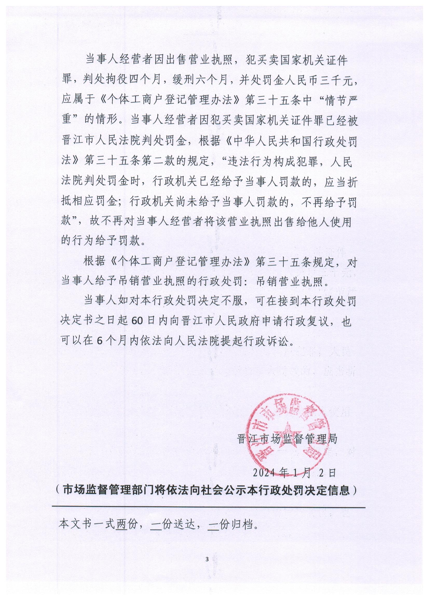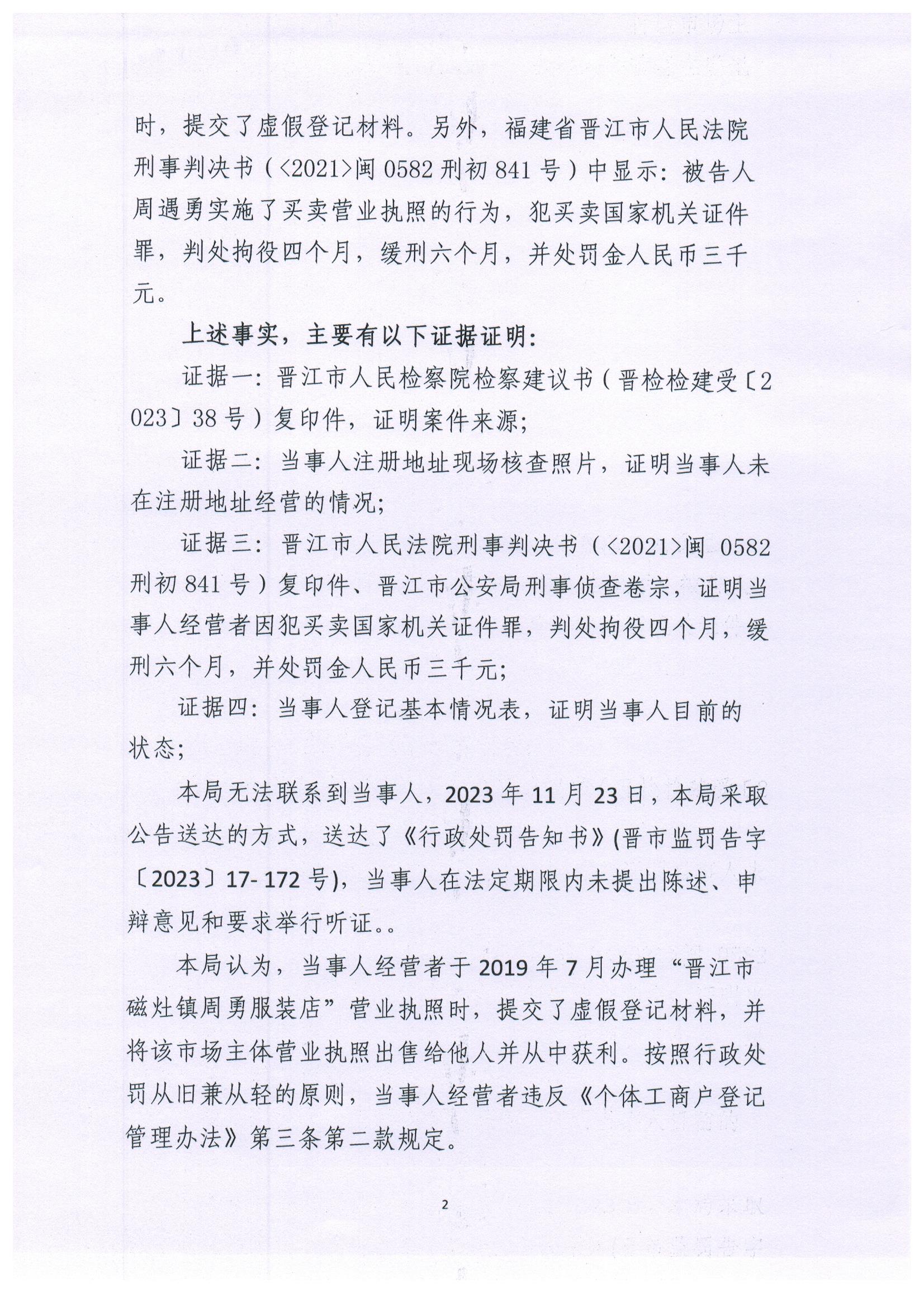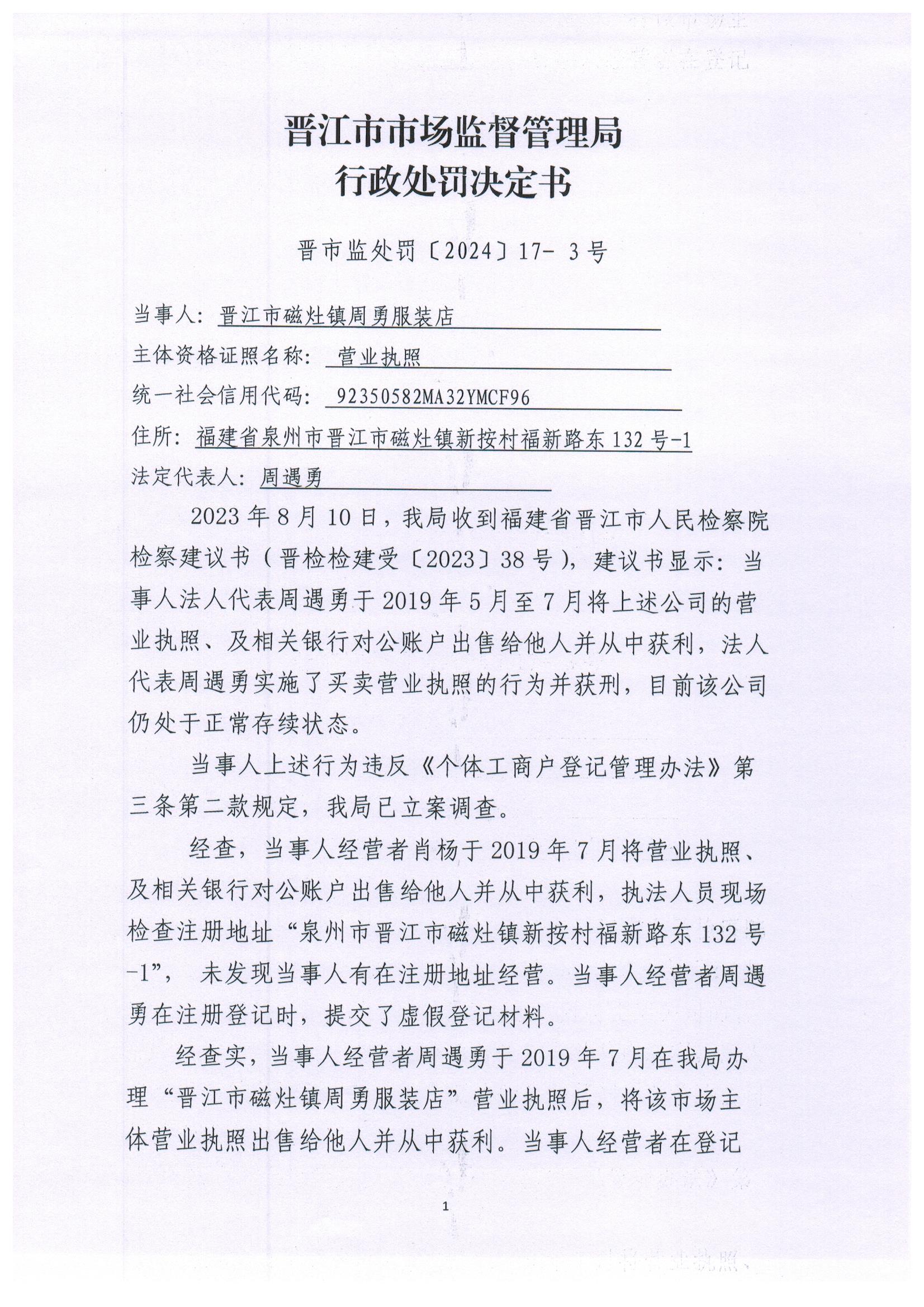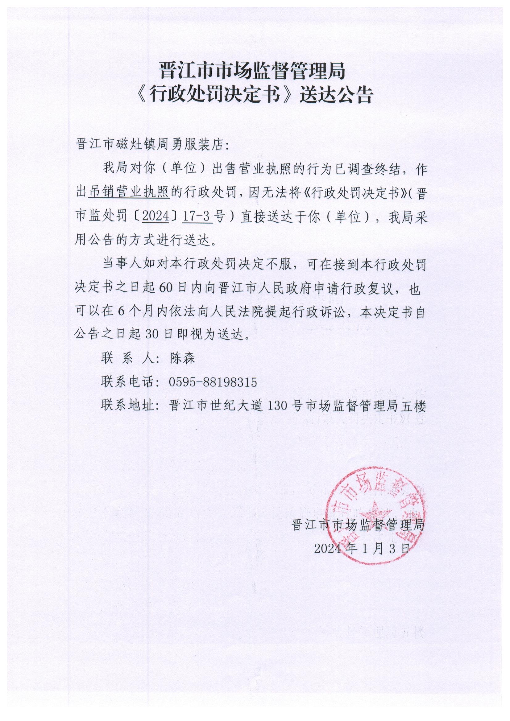 晋江市市场监督管理局行政处罚决定书送达公告(晋江市磁灶镇周勇服装店)
