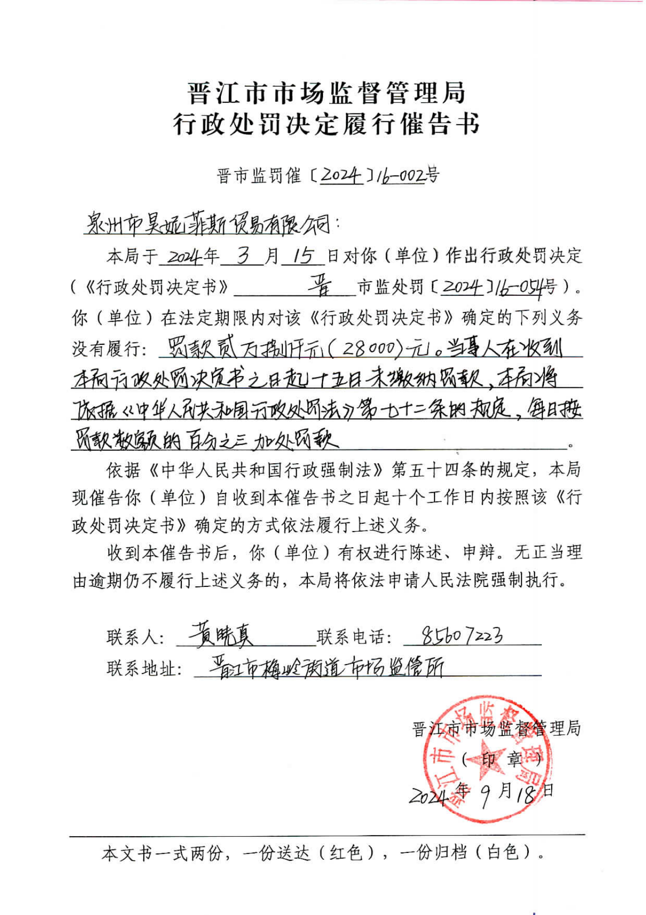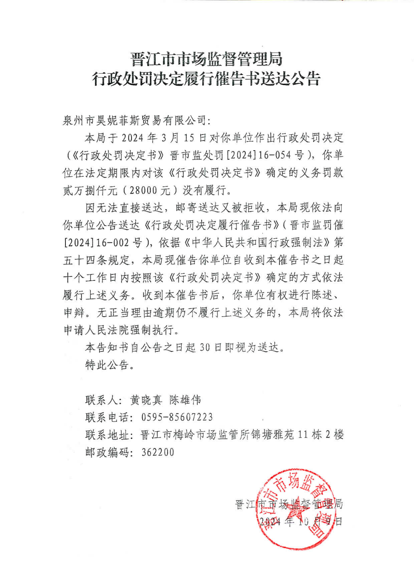 晋江市市场监督管理局行政处罚决定履行催告书送达公告(泉州市昊妮菲斯贸易有限公司)