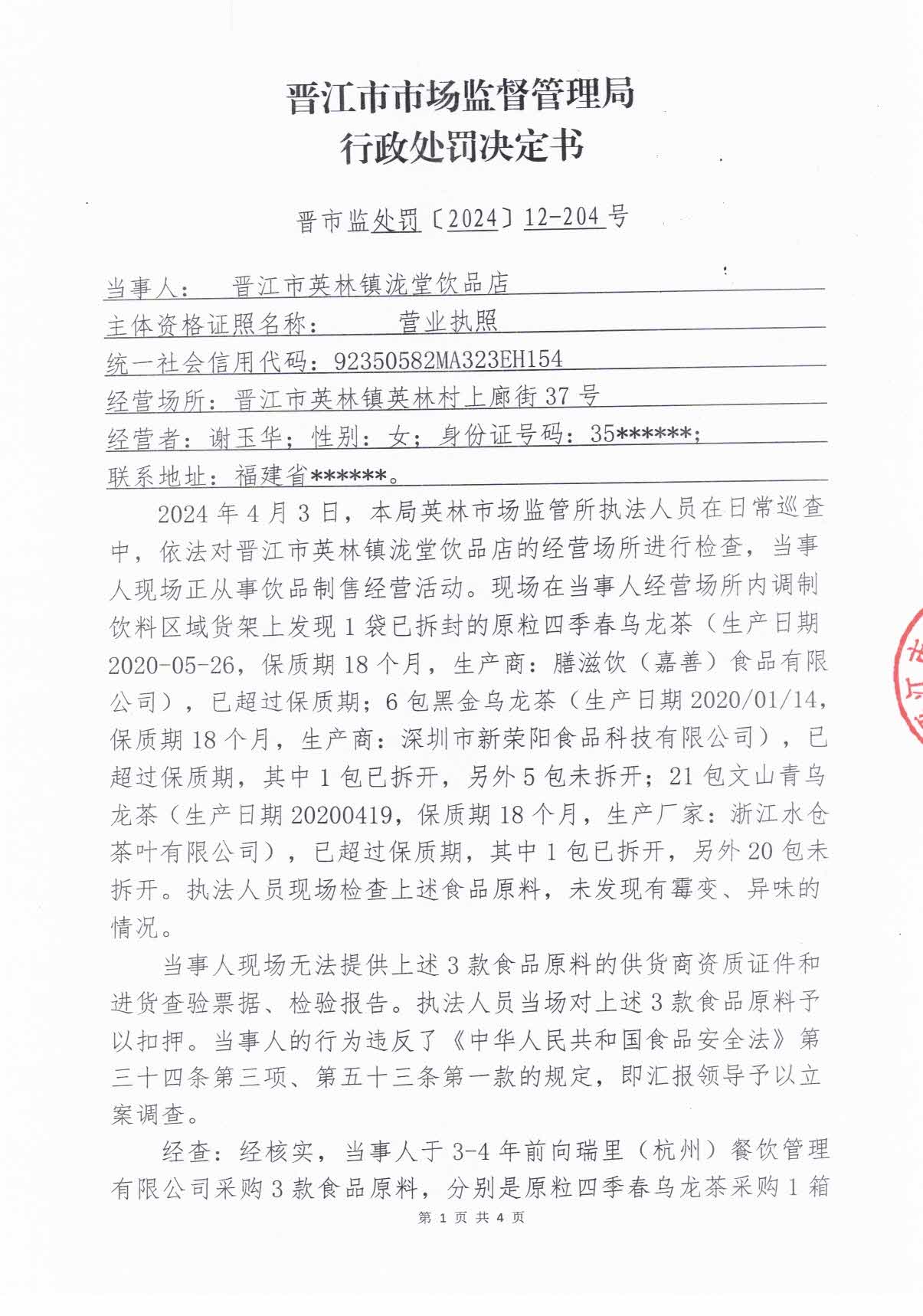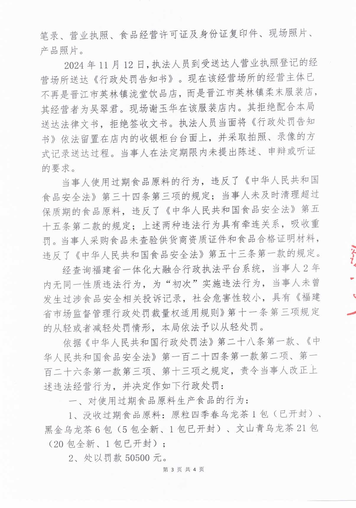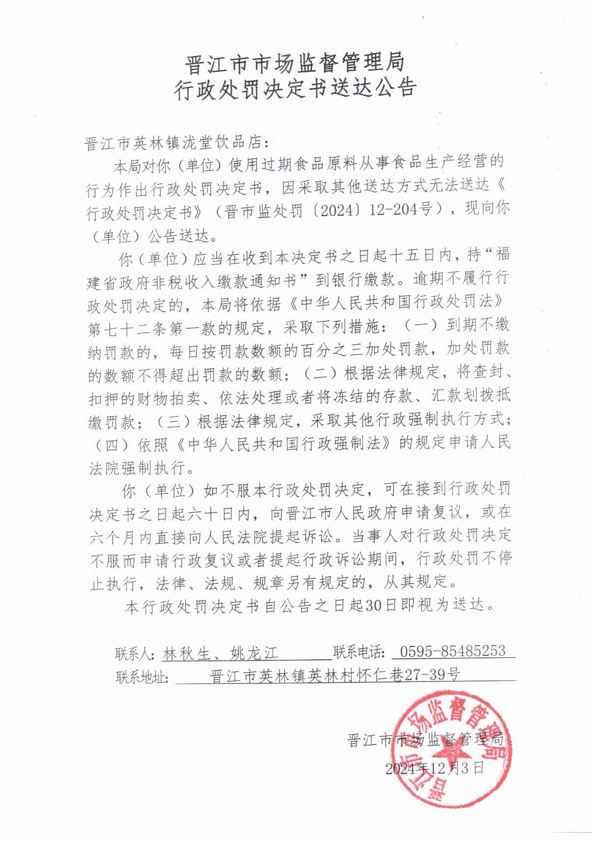 晋江市市场监督管理局行政处罚决定书送达公告(晋江市英林镇泷堂饮品店)