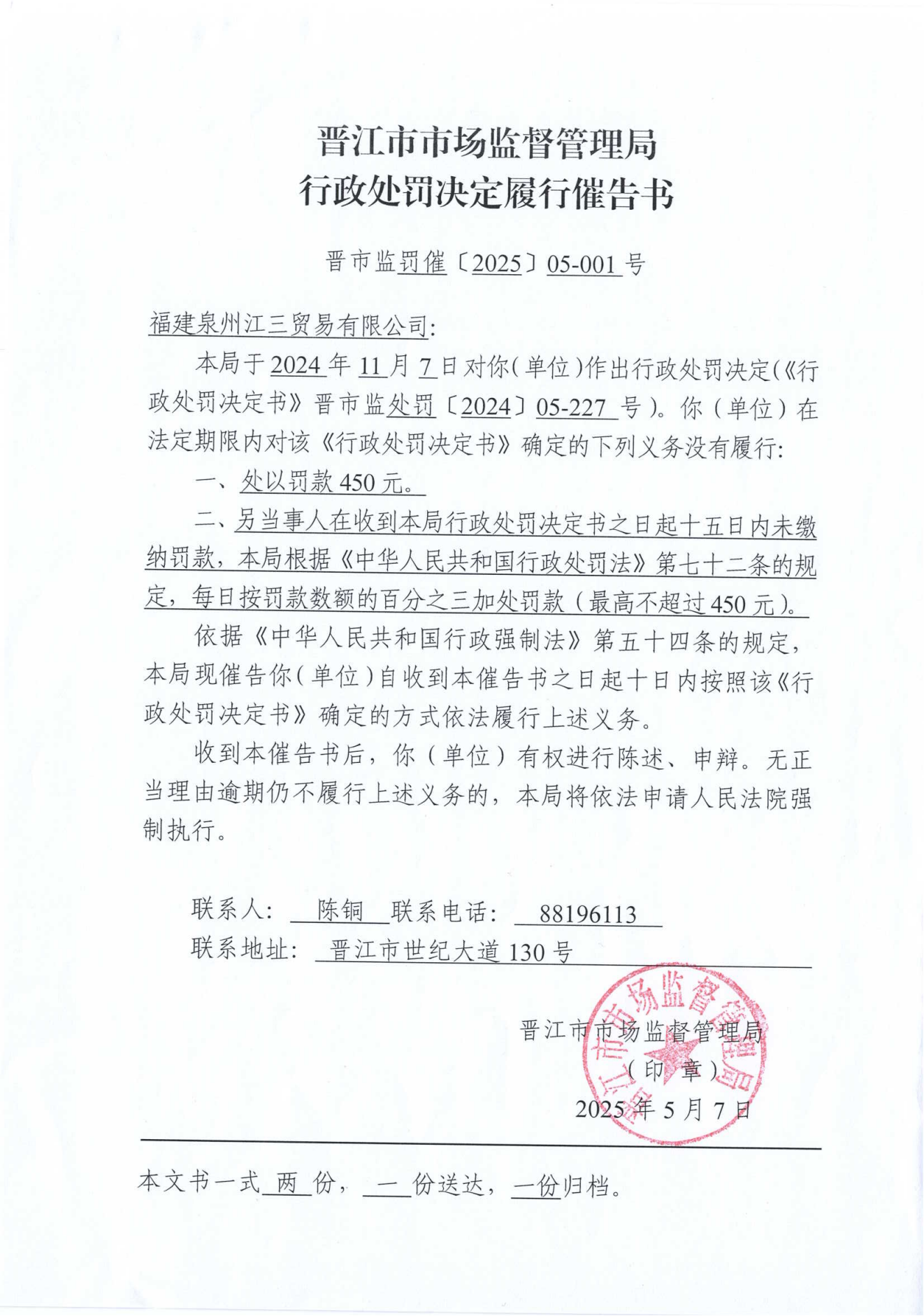 晋江市市场监督管理局行政处罚决定履行催告书送达公告(福建泉州江三贸易有限公司)