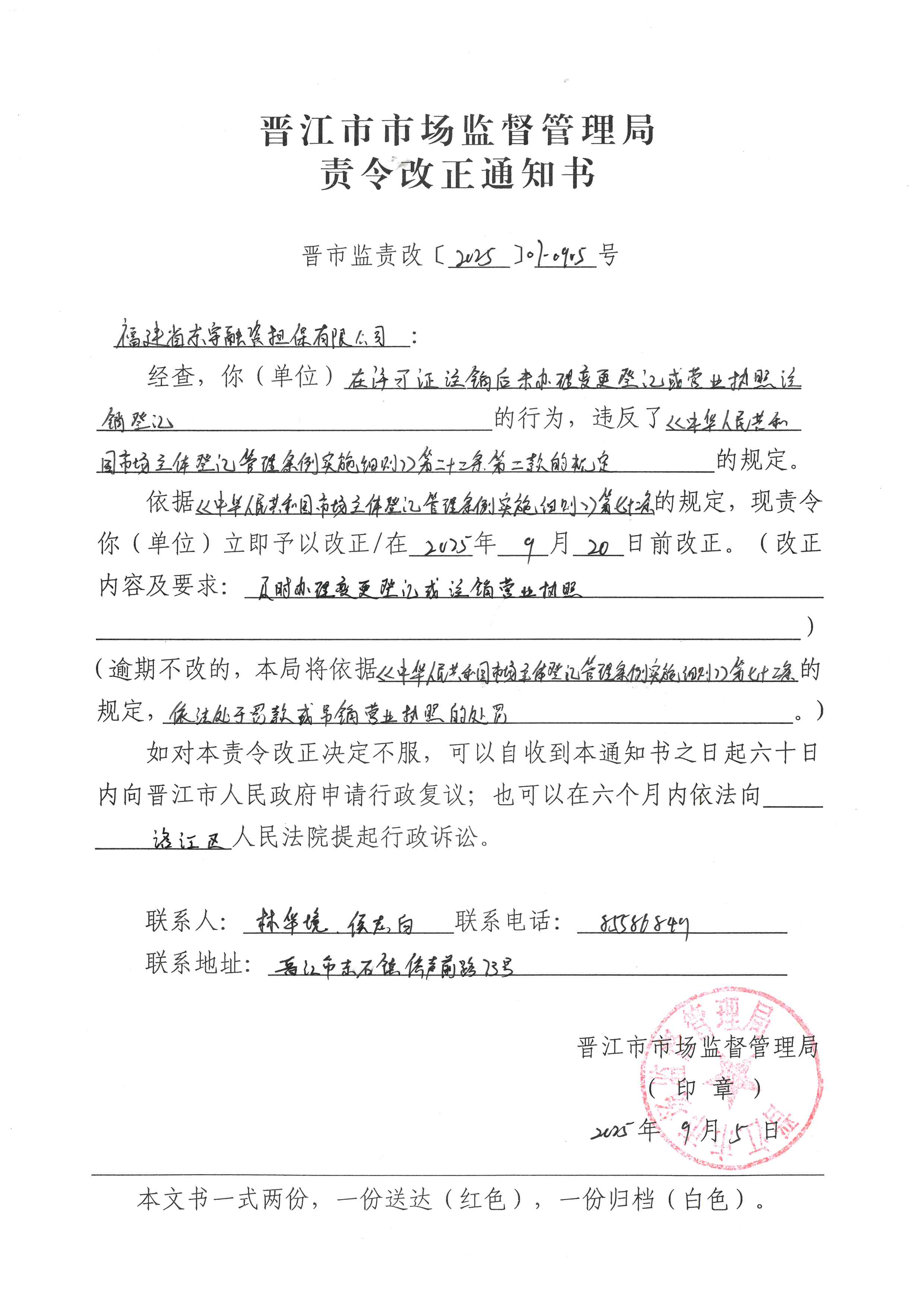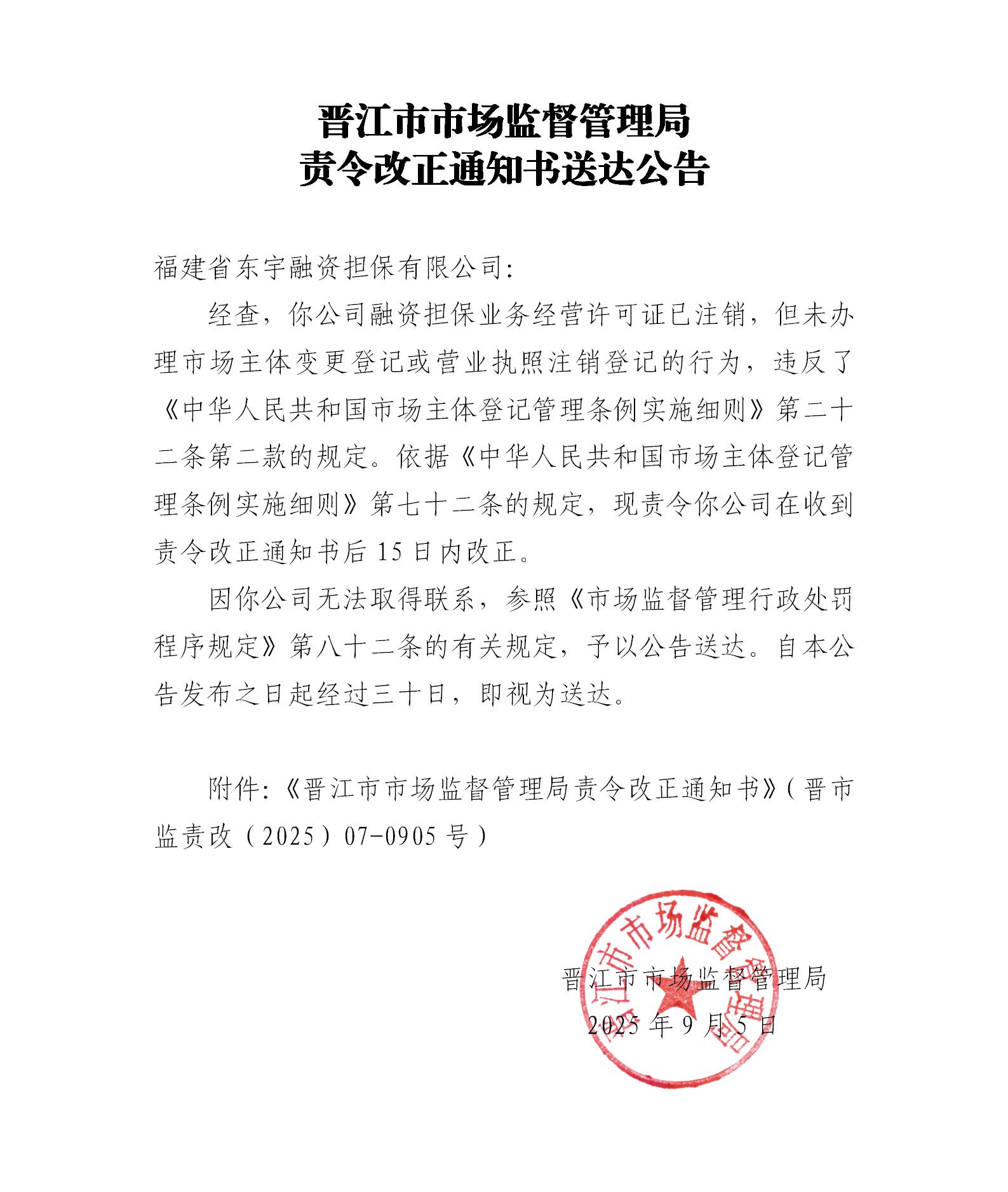 晋江市市场监督管理局责令改正通知书送达公告(福建省东宇融资担保有限公司)