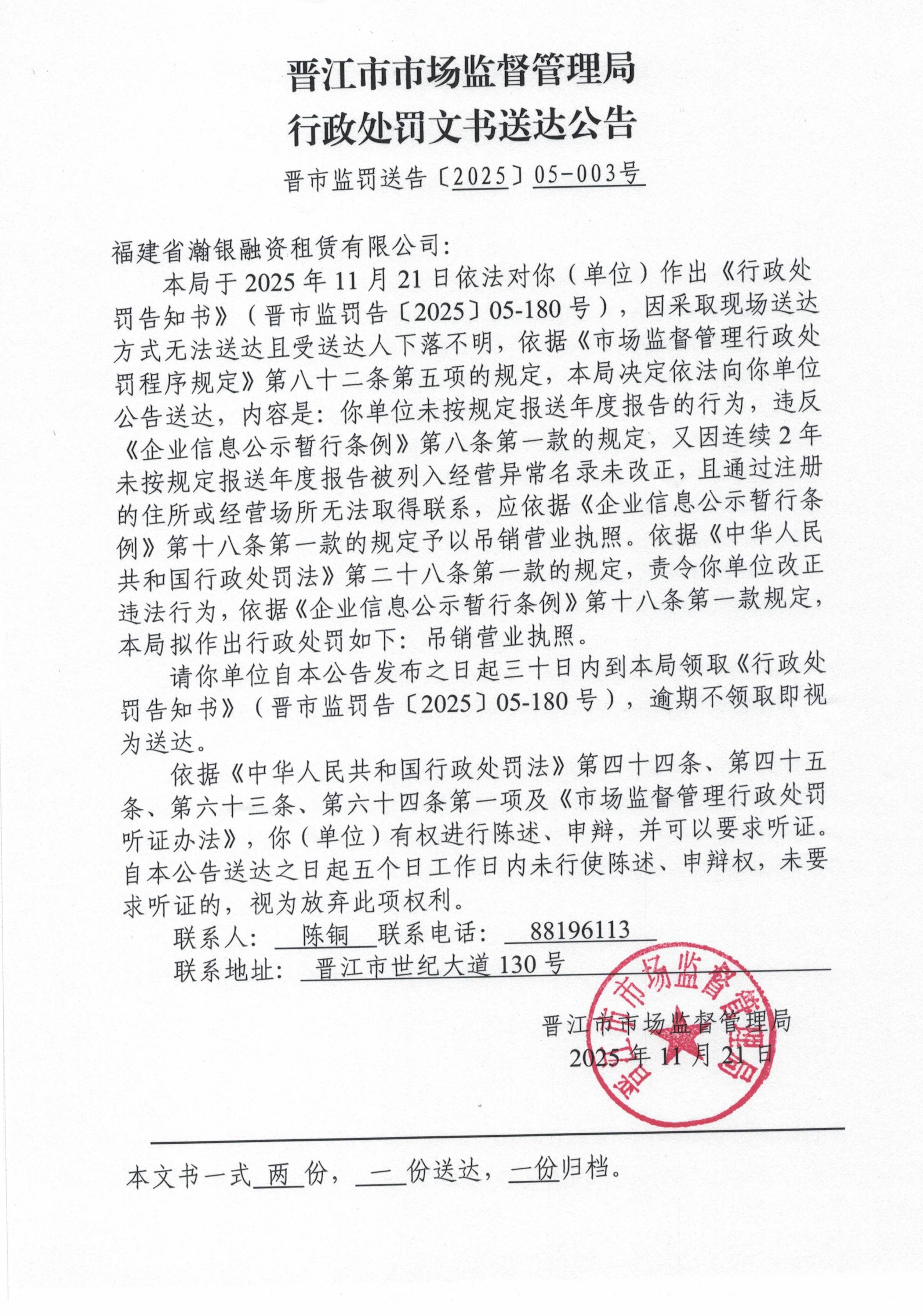 晋江市市场监督管理局行政处罚文书送达公告(晋市监罚送告[2025]05-003号 福建省瀚银融资租赁有限公司)