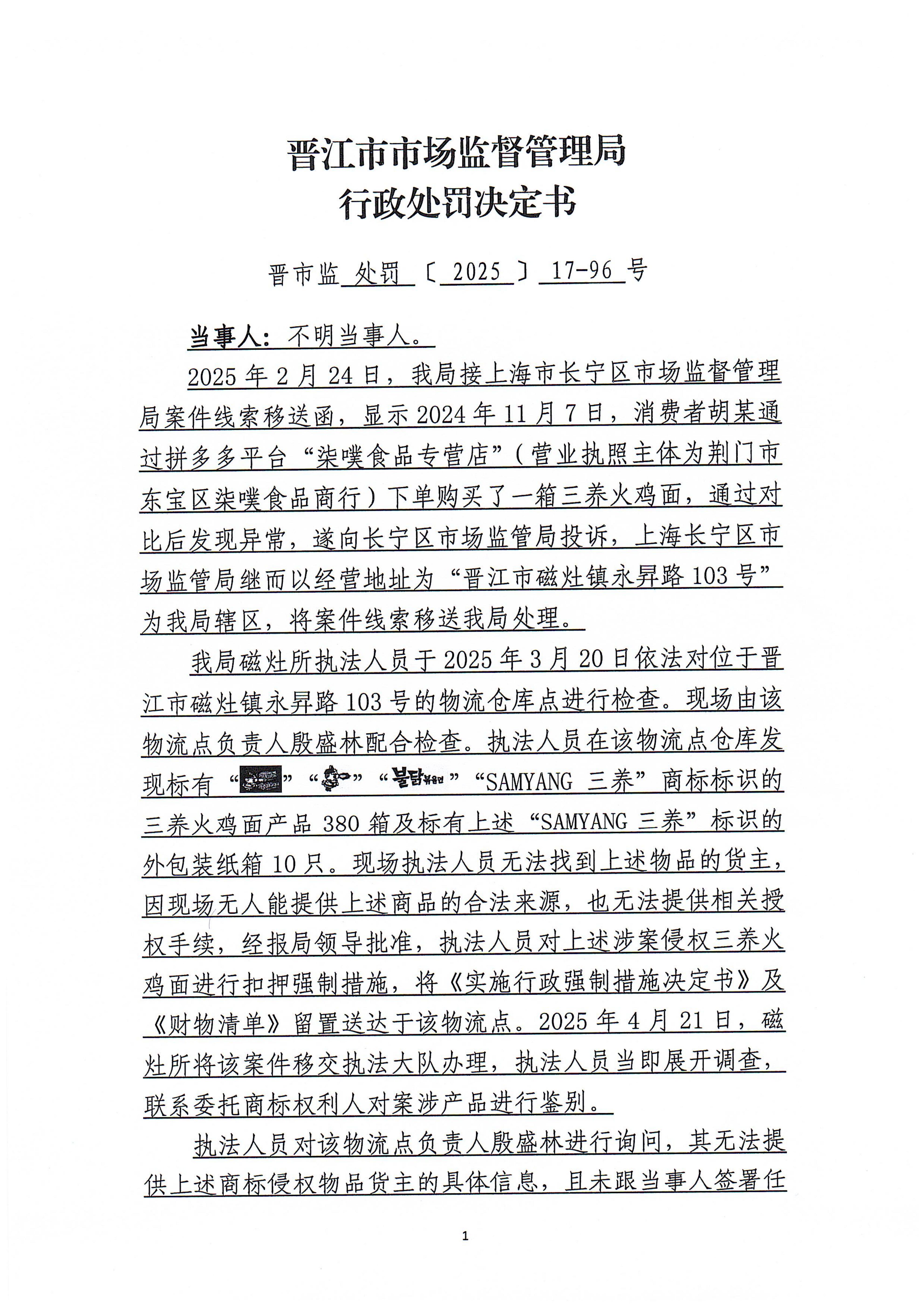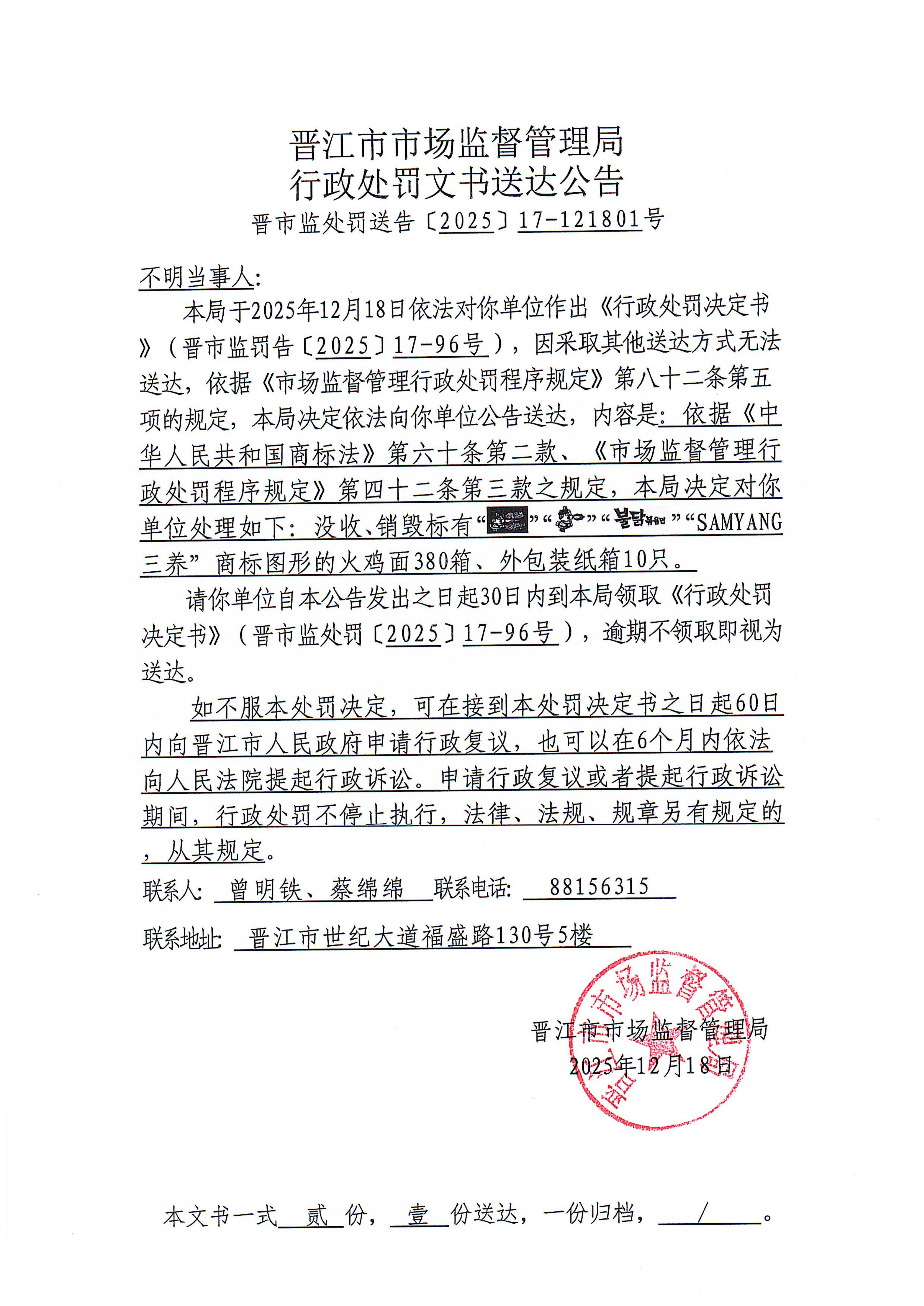 晋江市市场监督管理局行政处罚文书送达公告(晋市监处罚送告〔2025〕17-121801号 不明当事人)