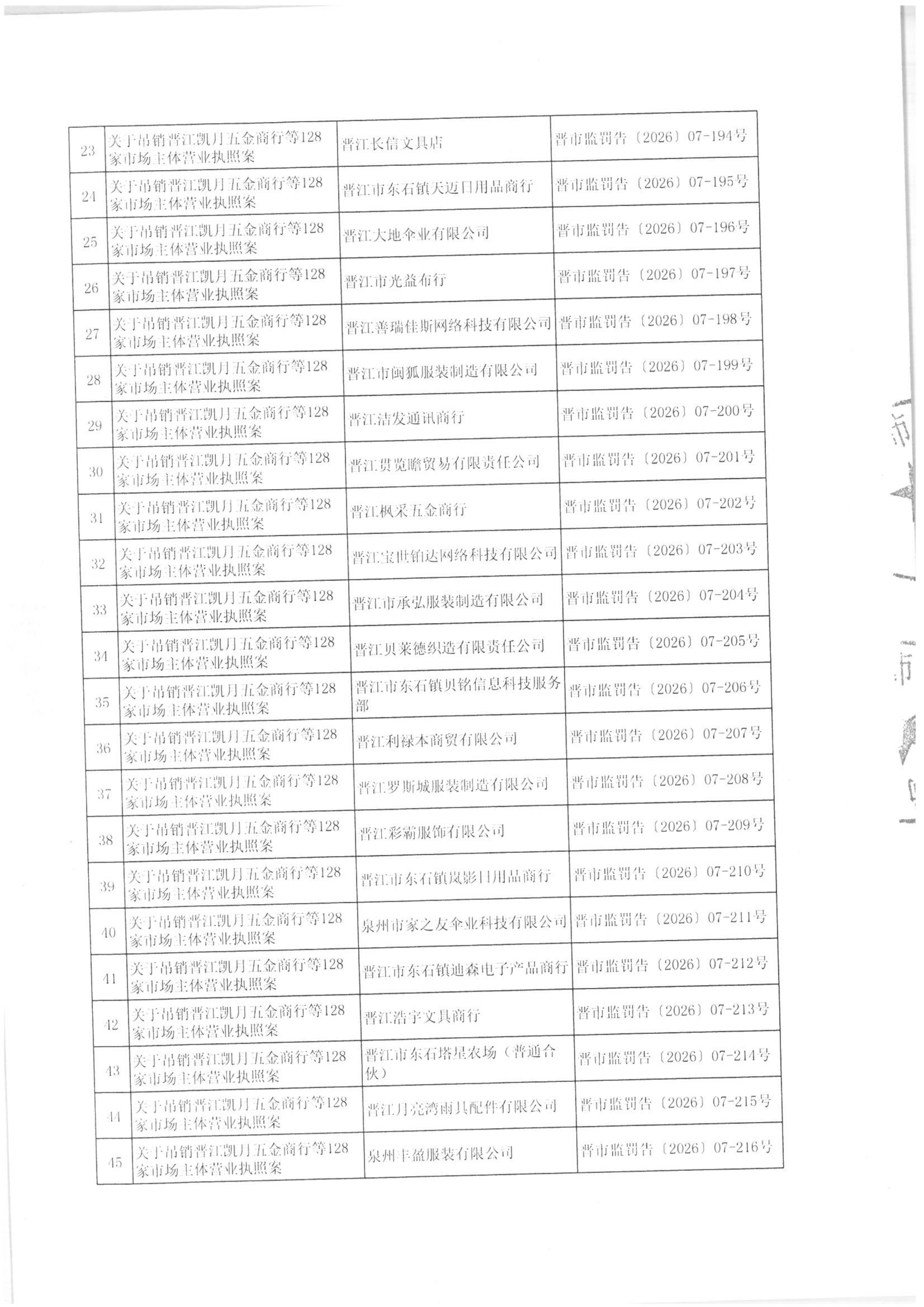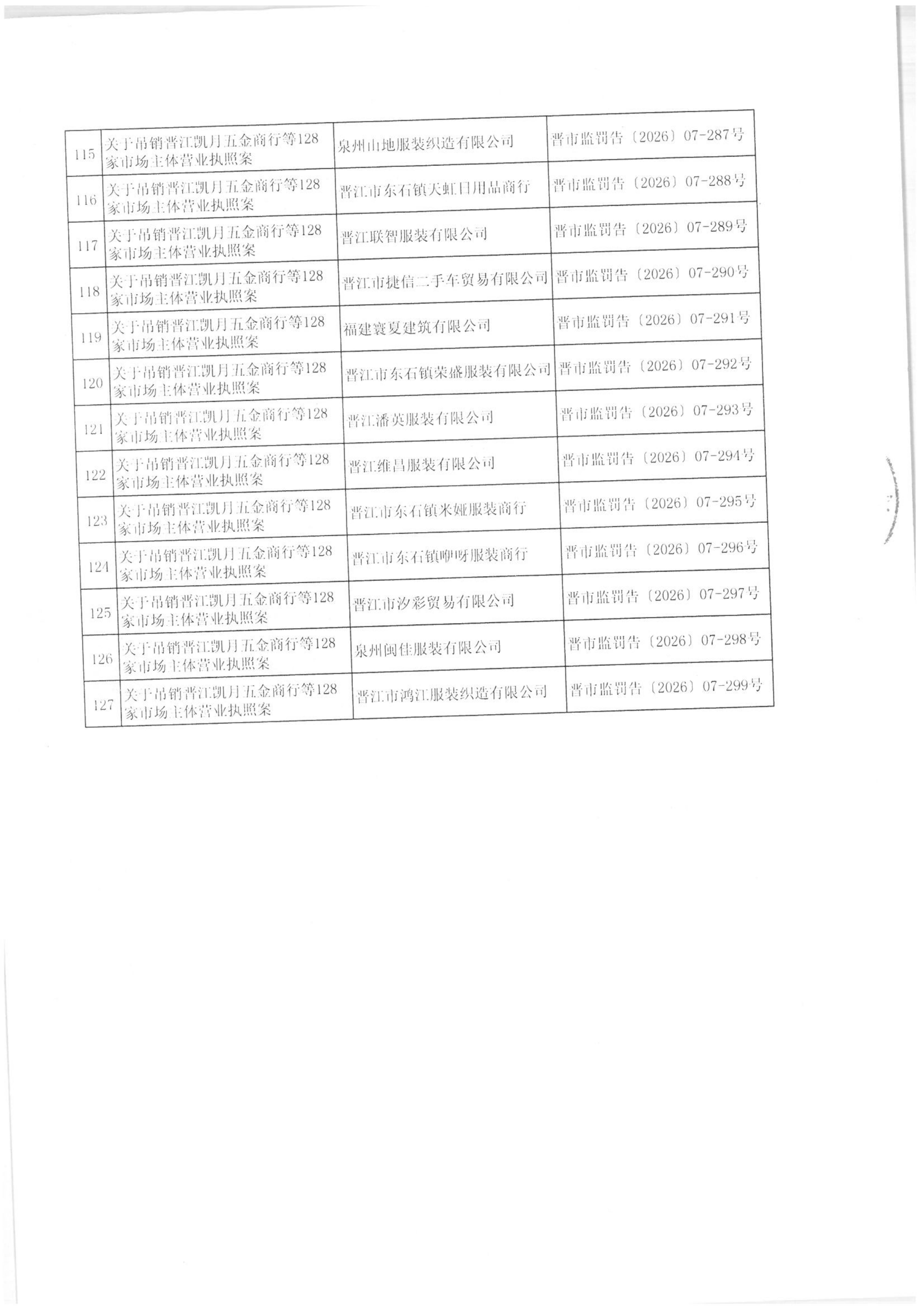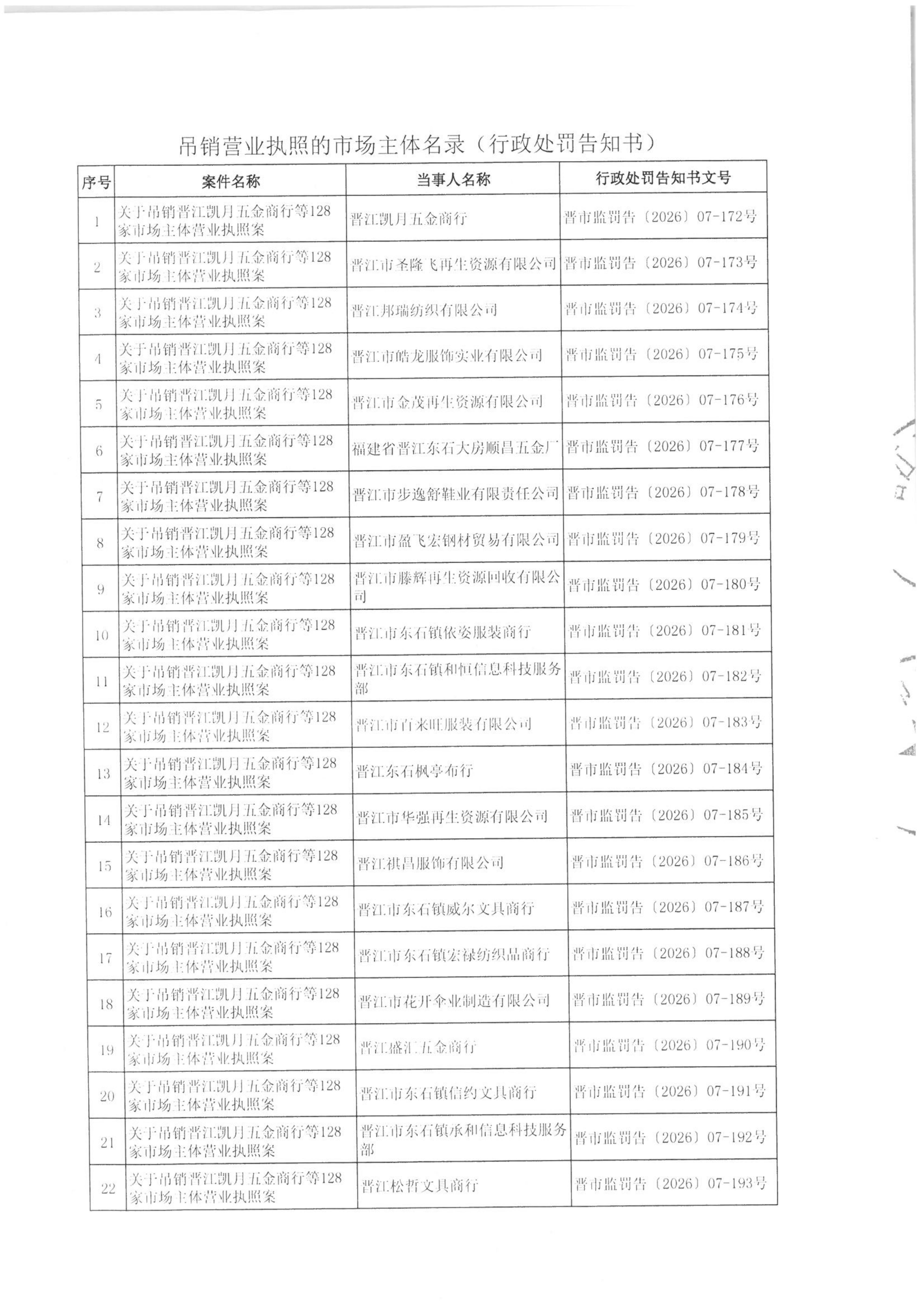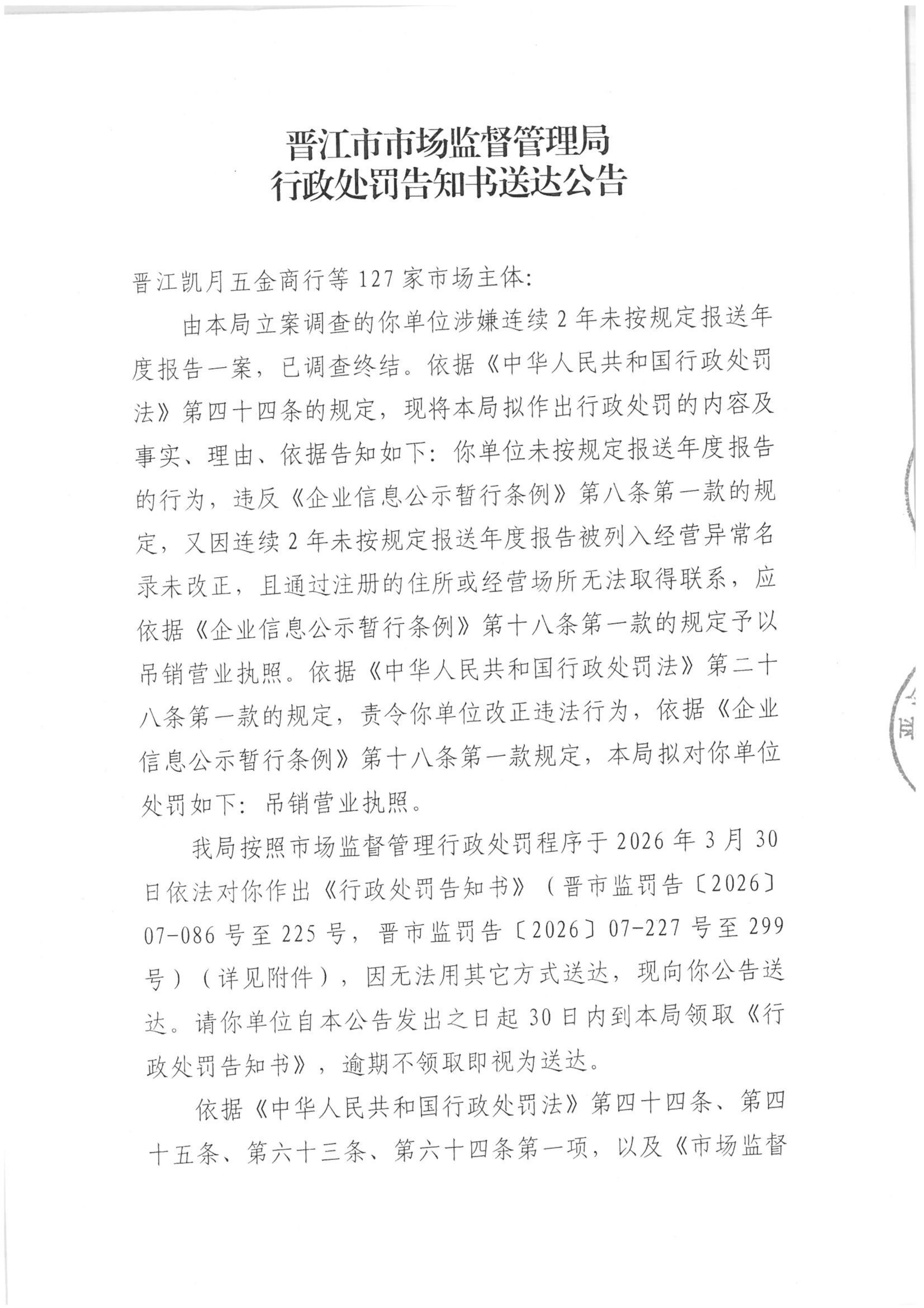 晋江市市场监督管理局行政处罚告知书送达公告(晋江凯月五金商行等127家市场主体)