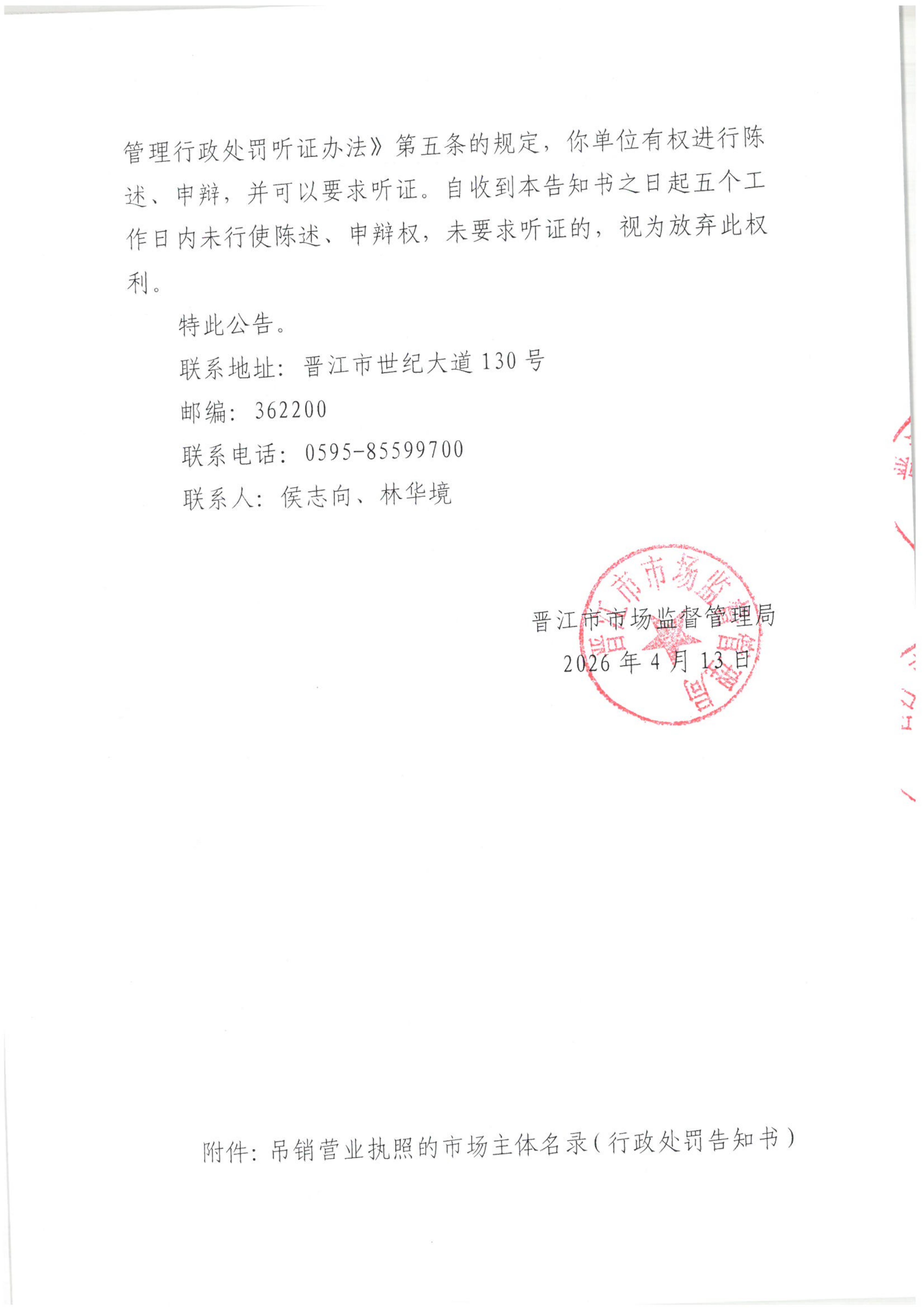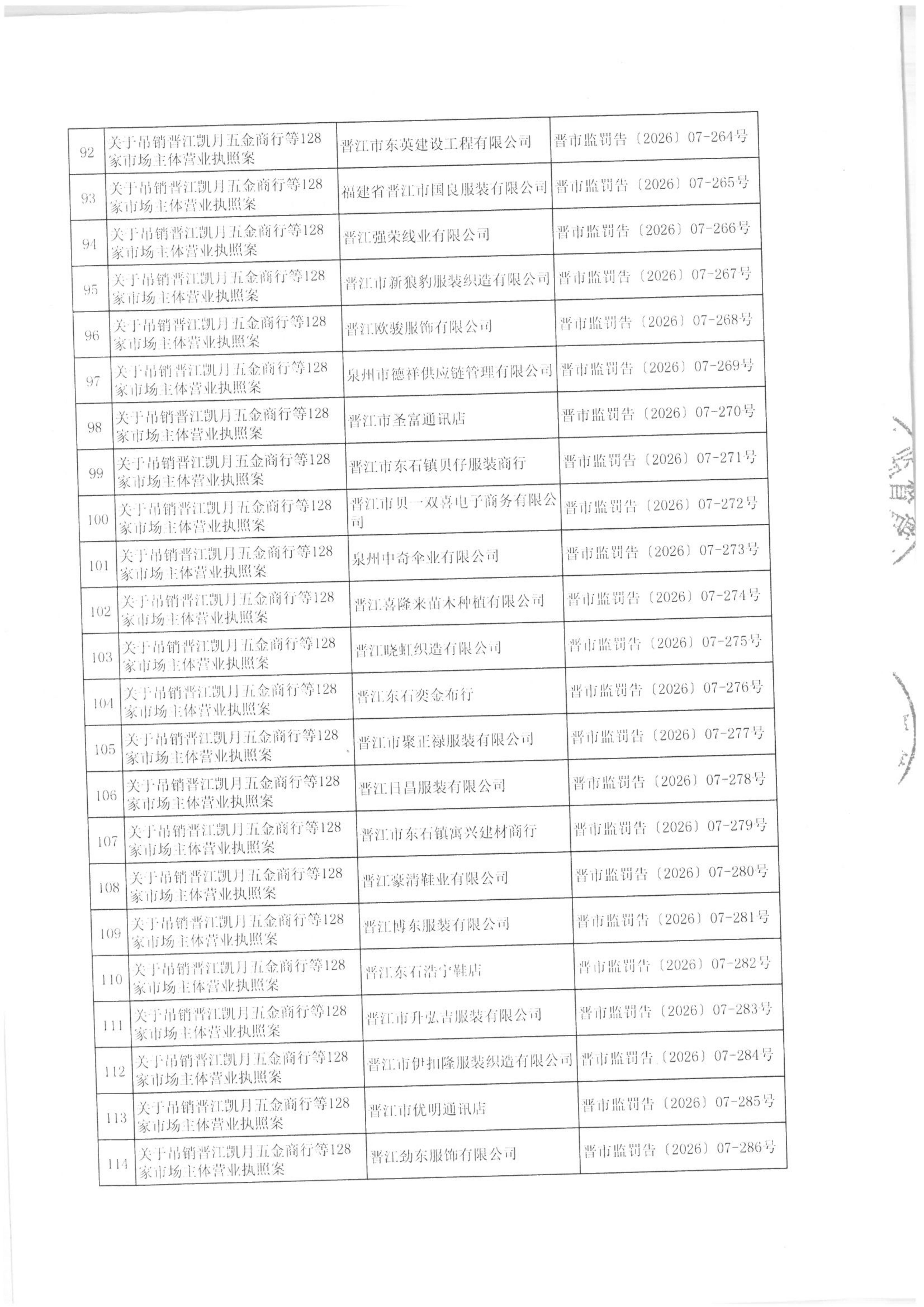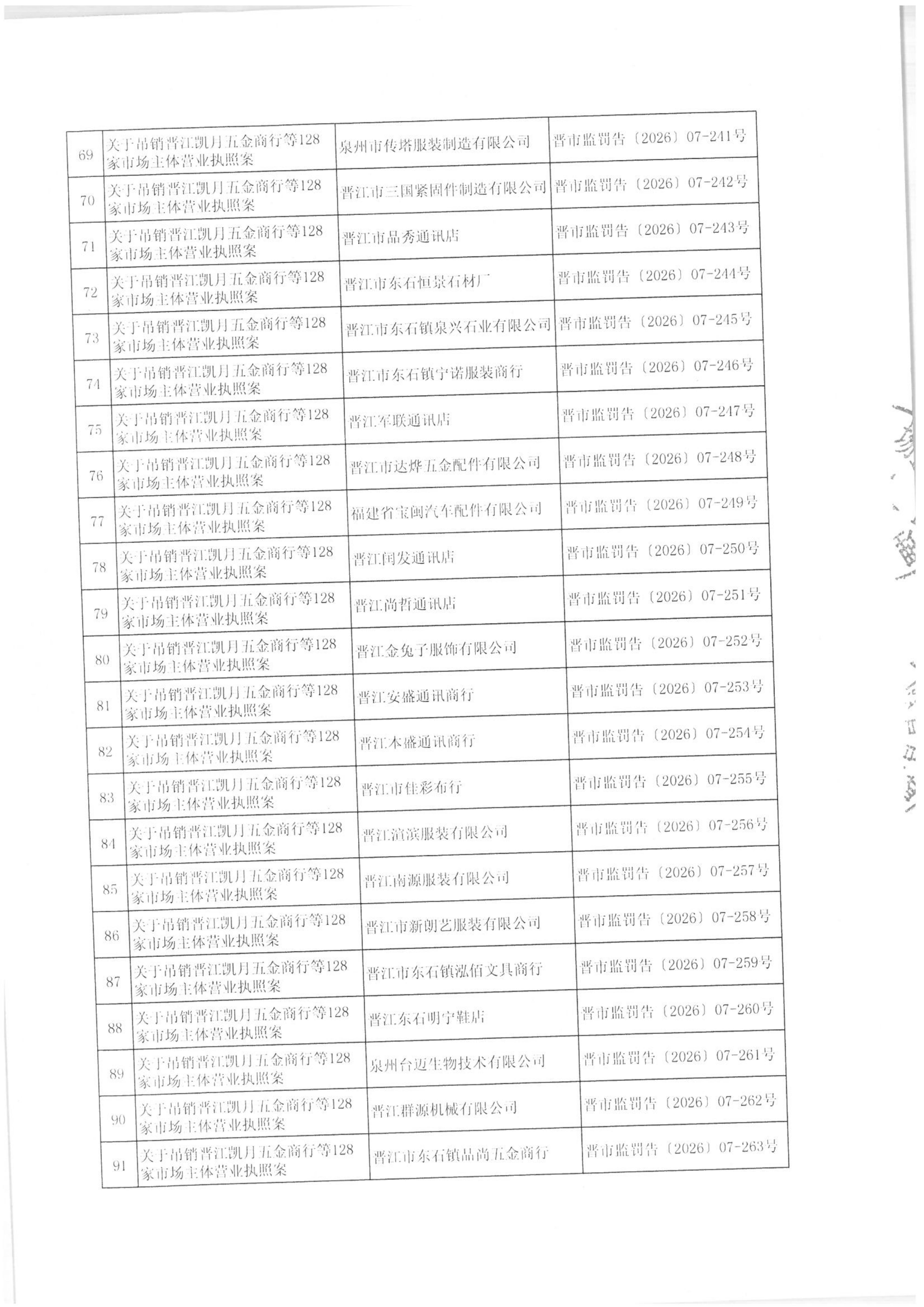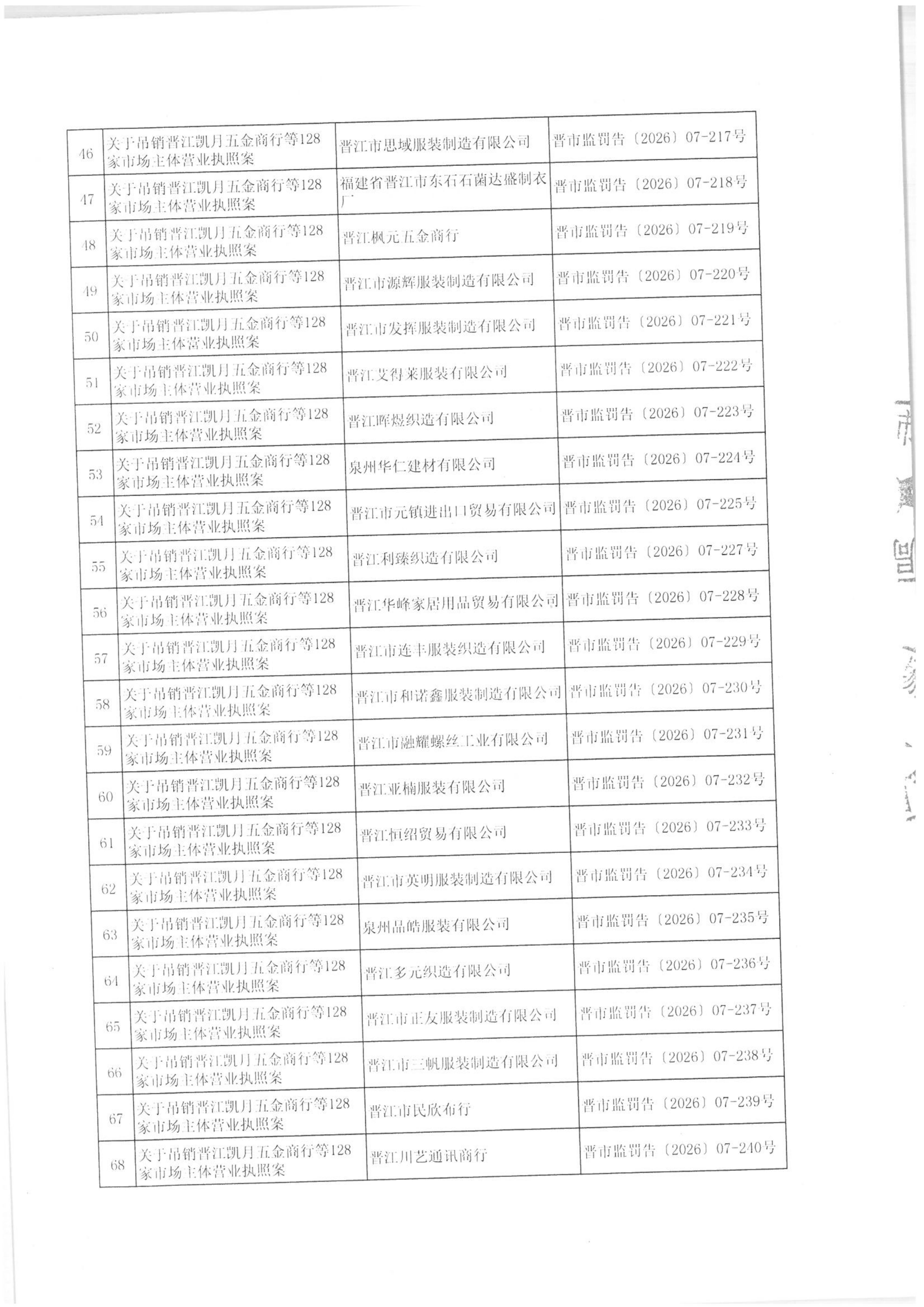晋江市市场监督管理局行政处罚告知书送达公告(晋江凯月五金商行等127家市场主体)