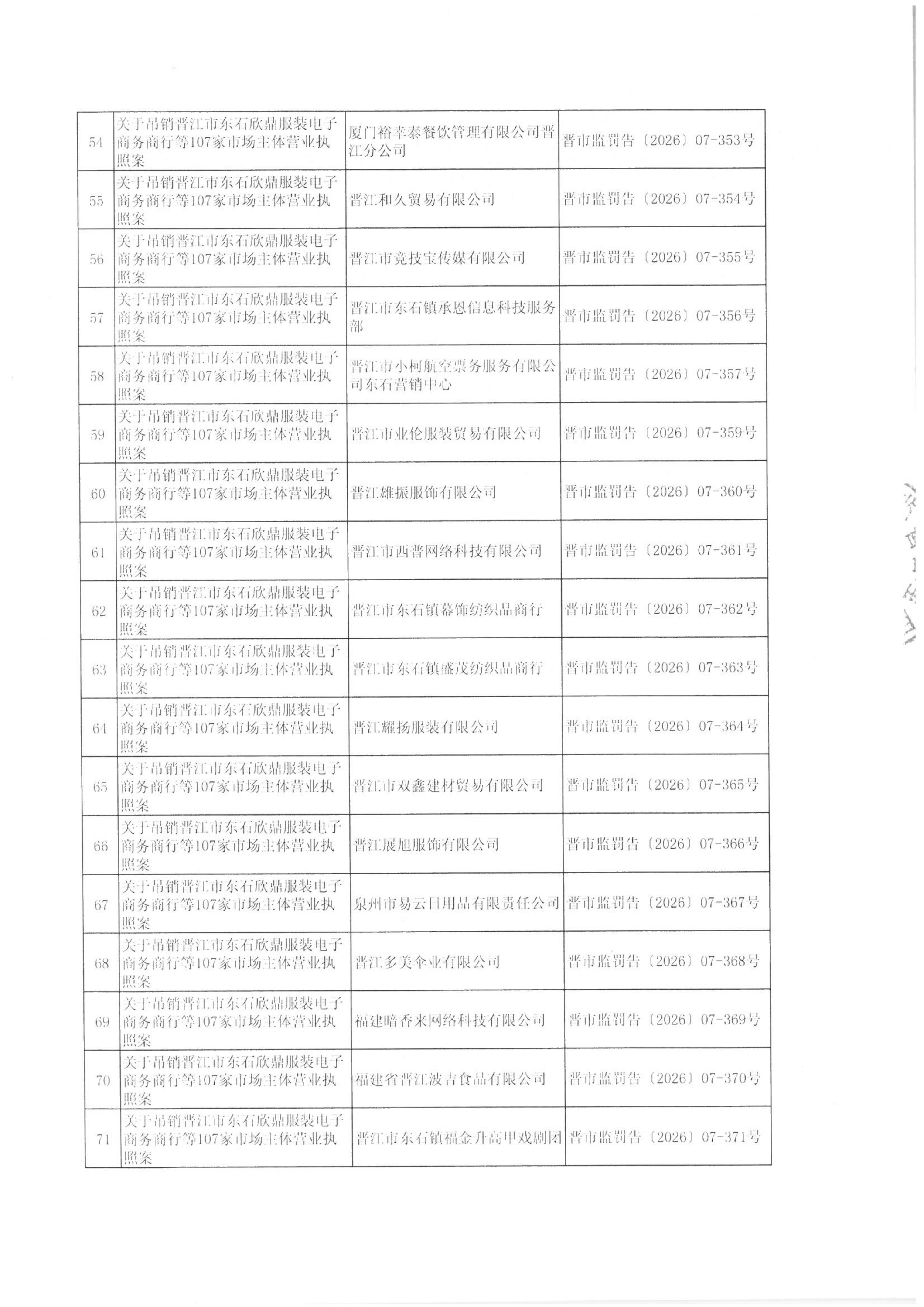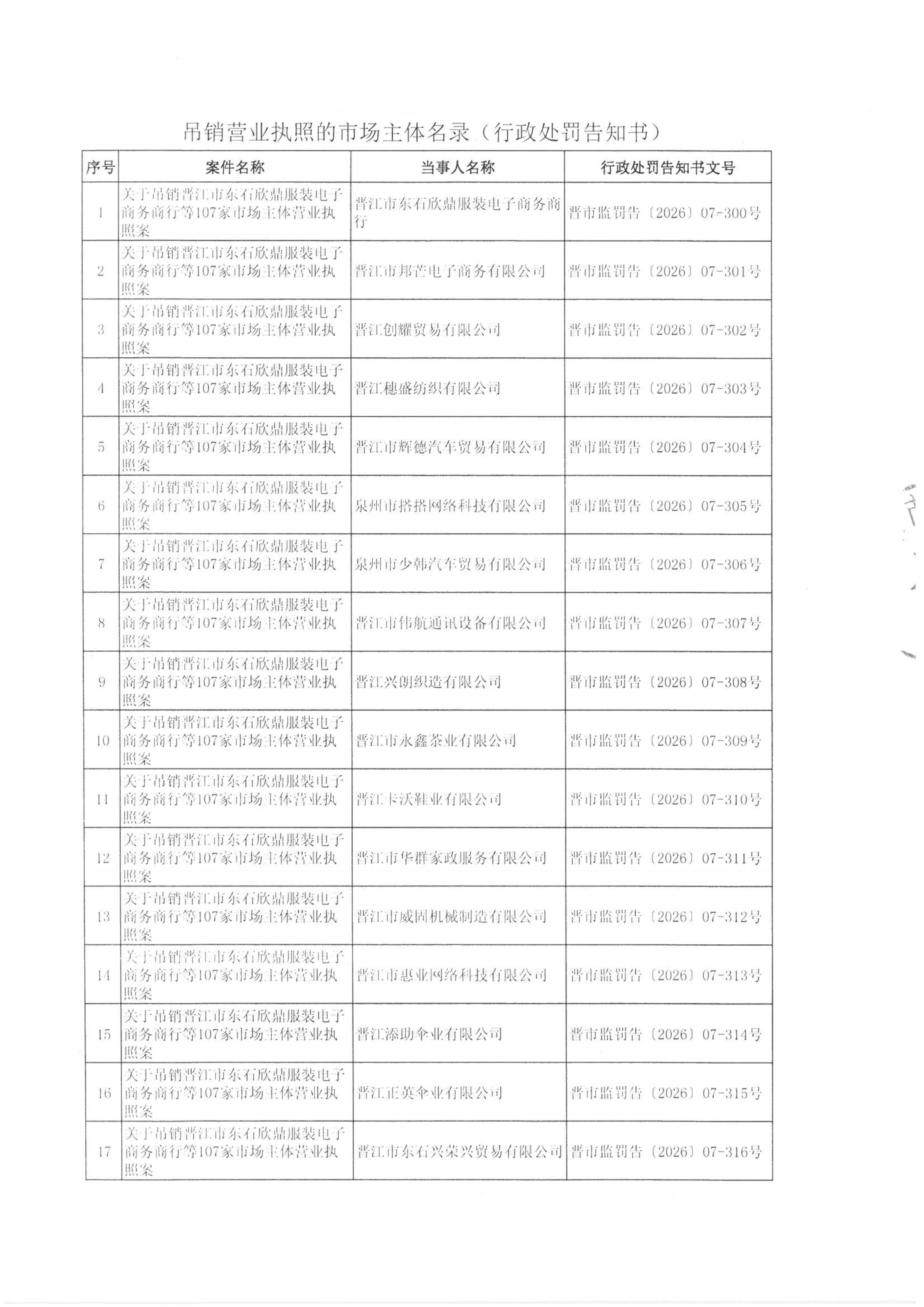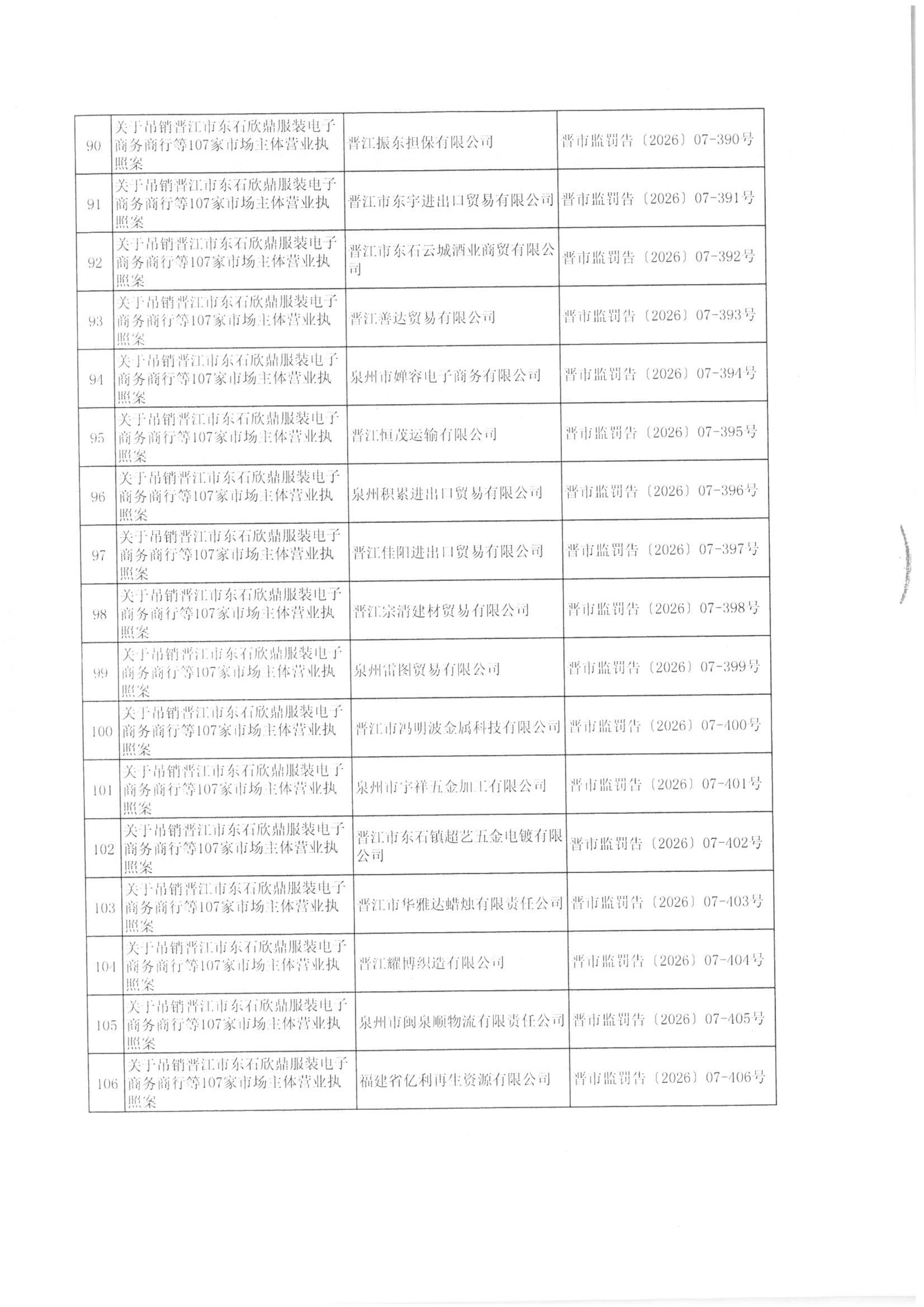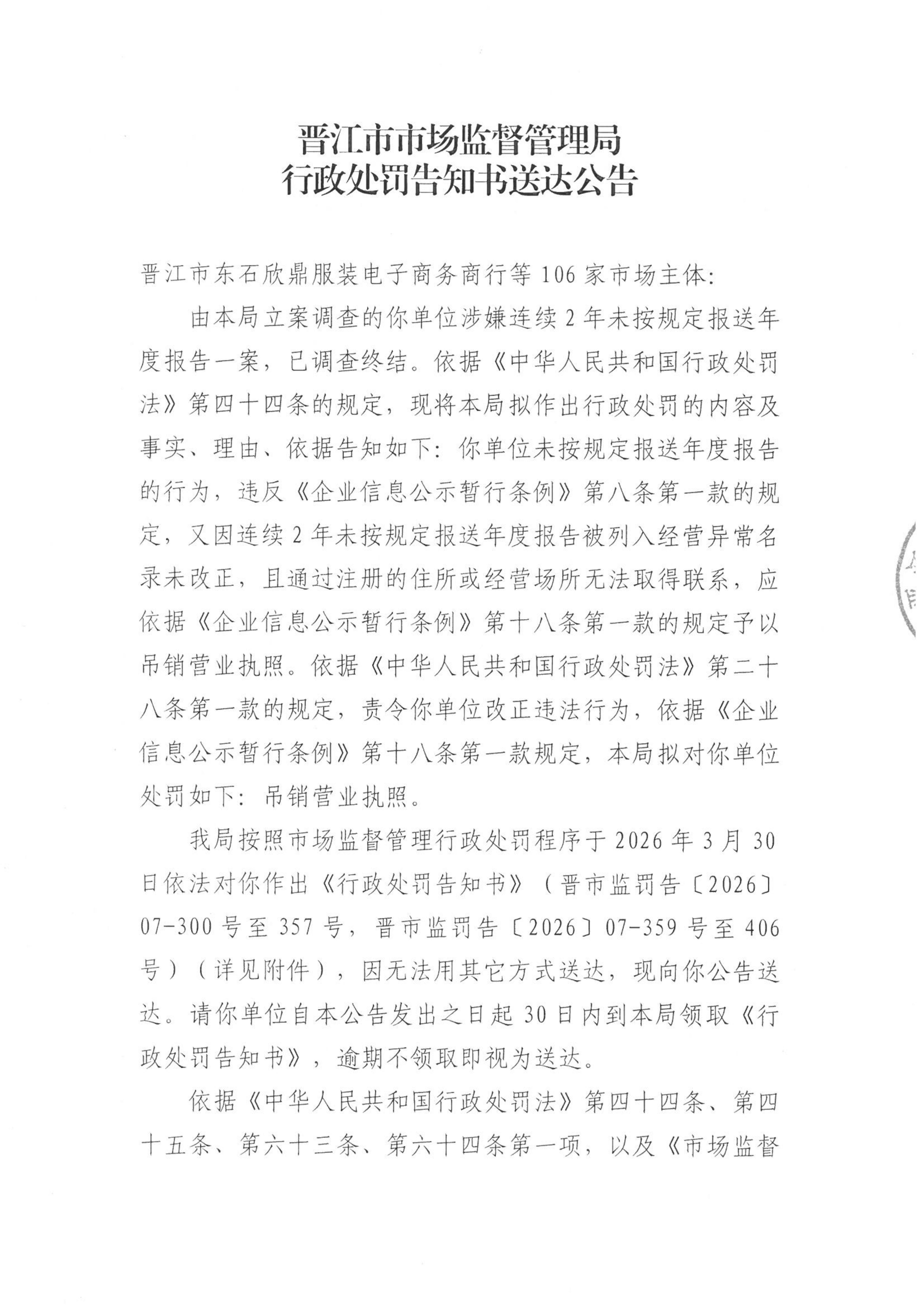 晋江市市场监督管理局行政处罚告知书送达公告(晋江市东石欣鼎服装电子商务商行等106家市场主体)