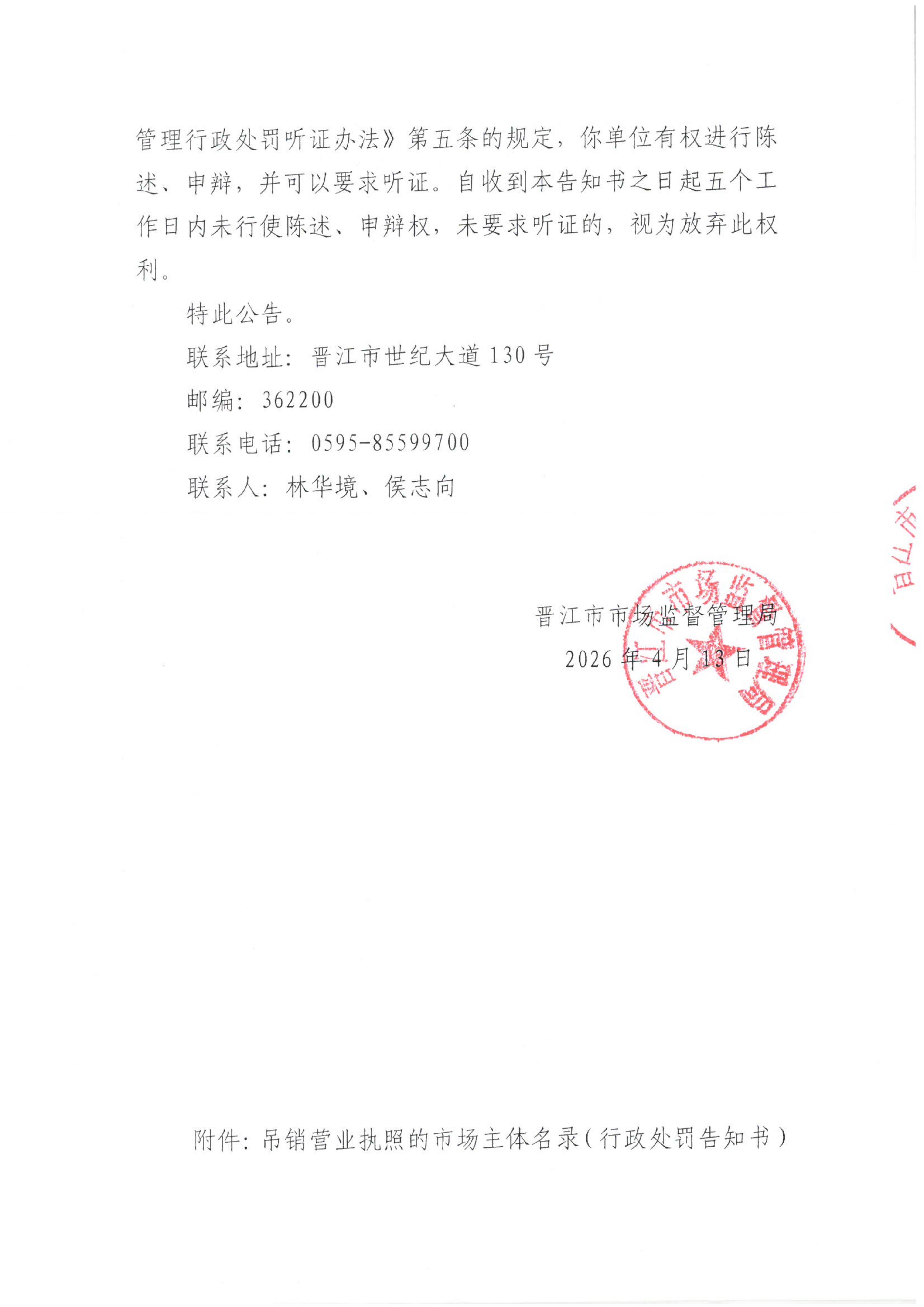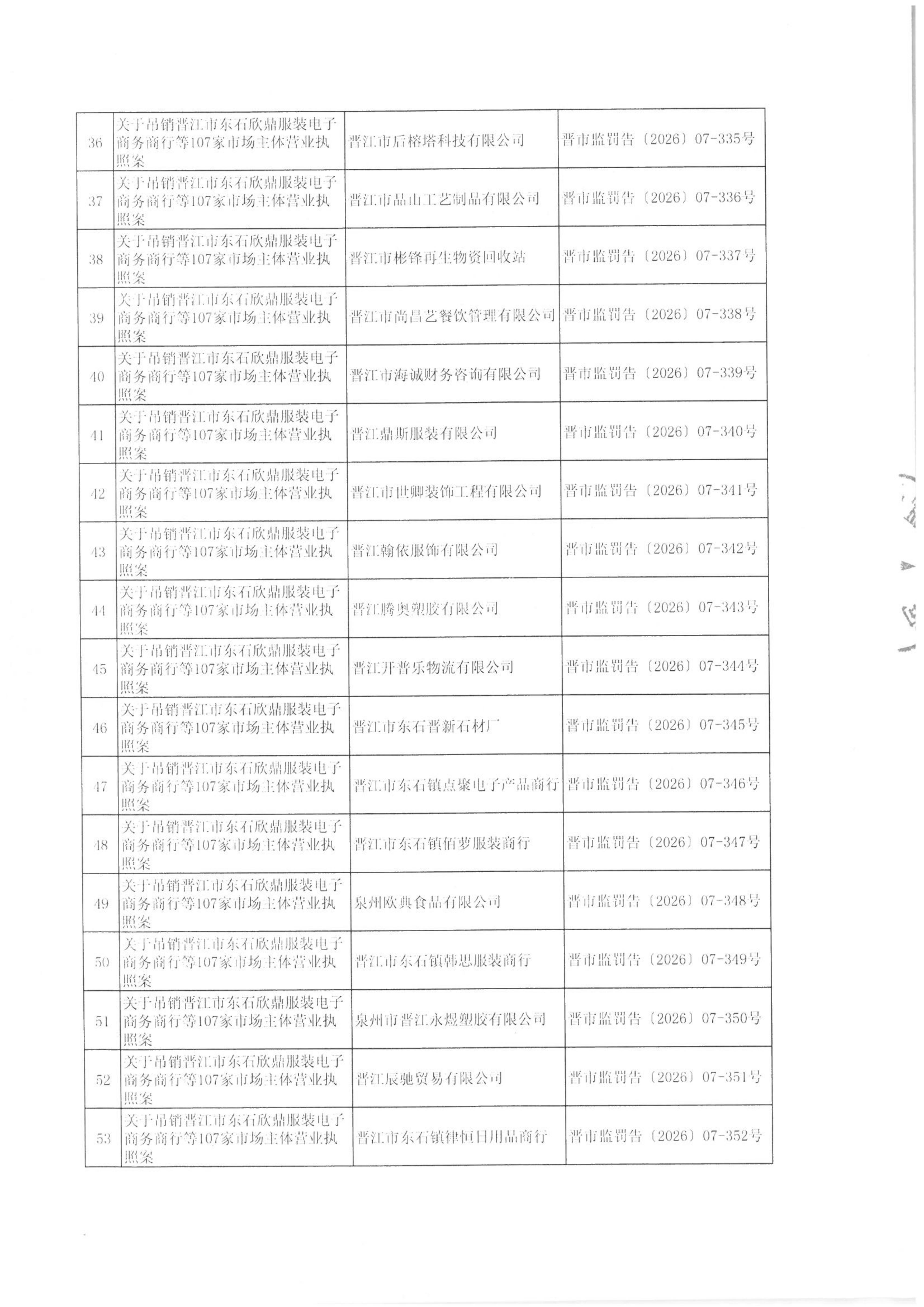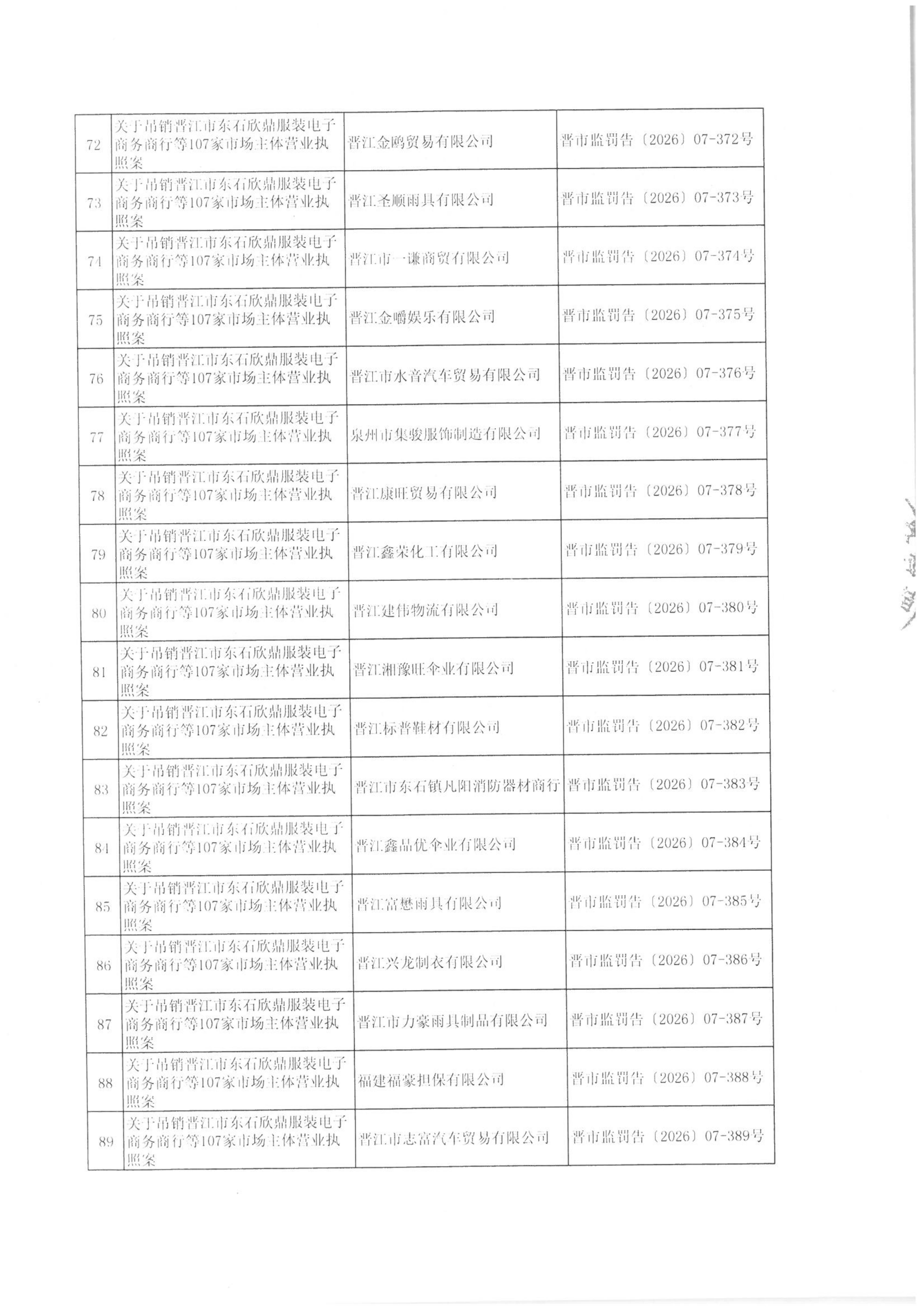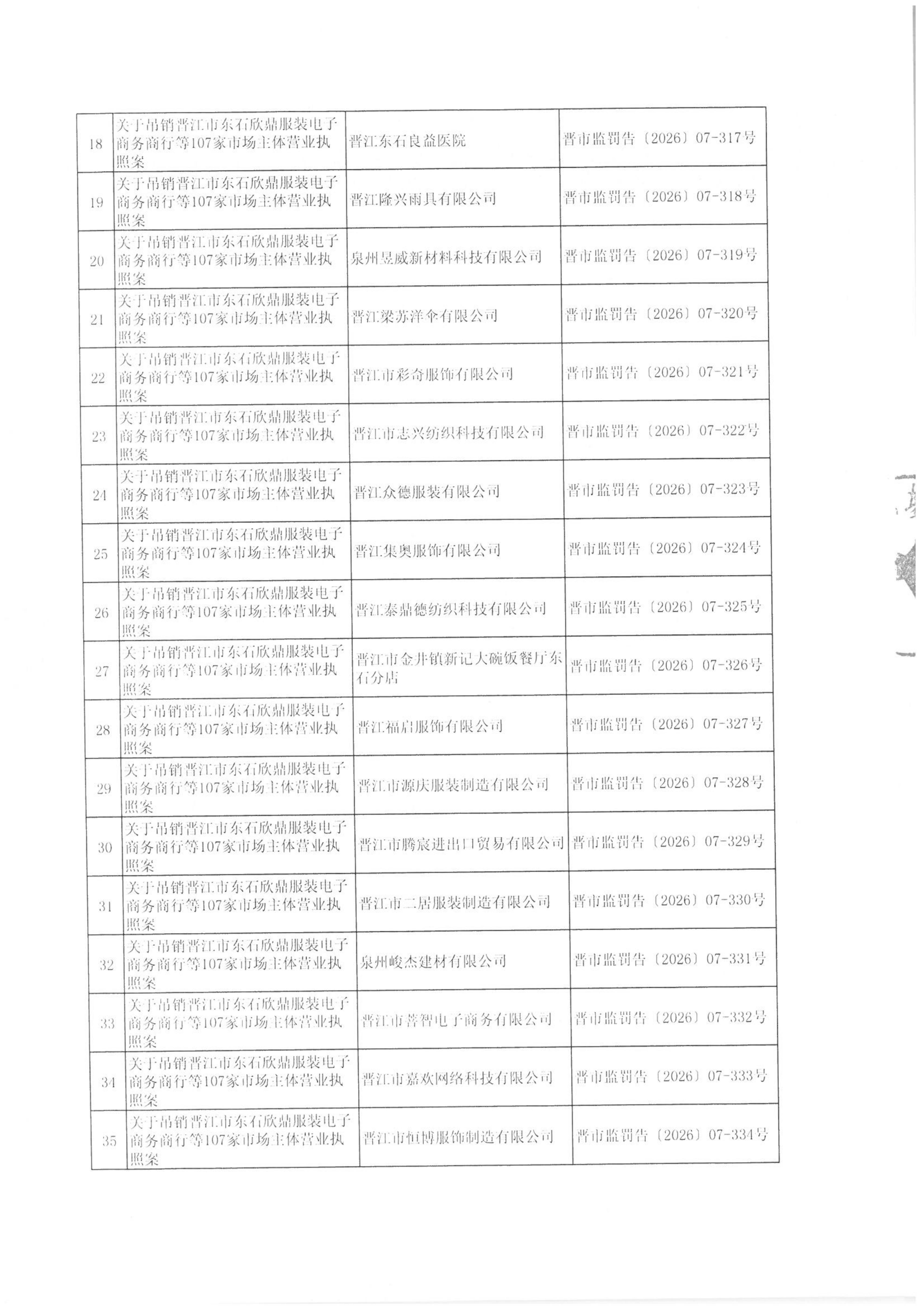 晋江市市场监督管理局行政处罚告知书送达公告(晋江市东石欣鼎服装电子商务商行等106家市场主体)