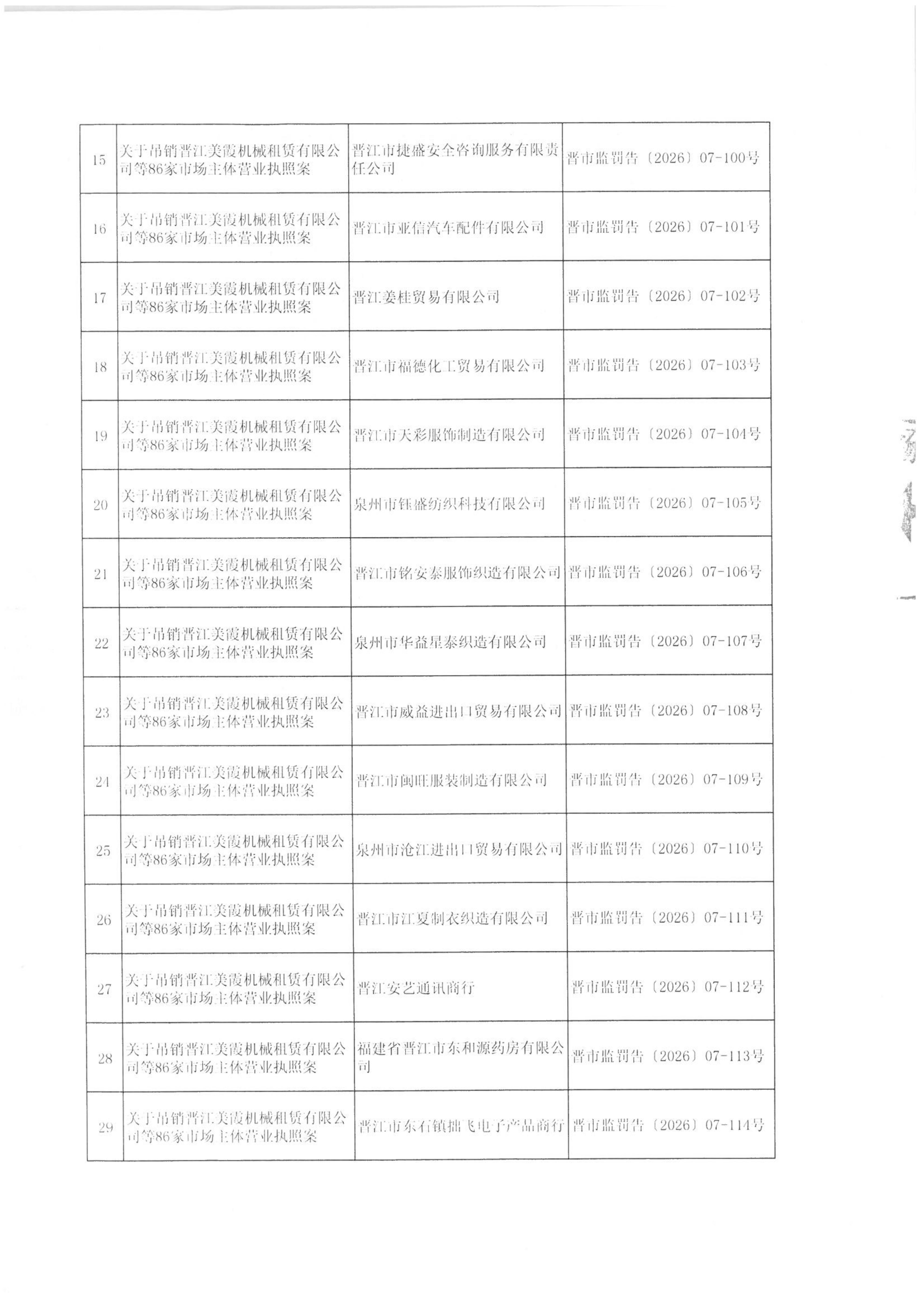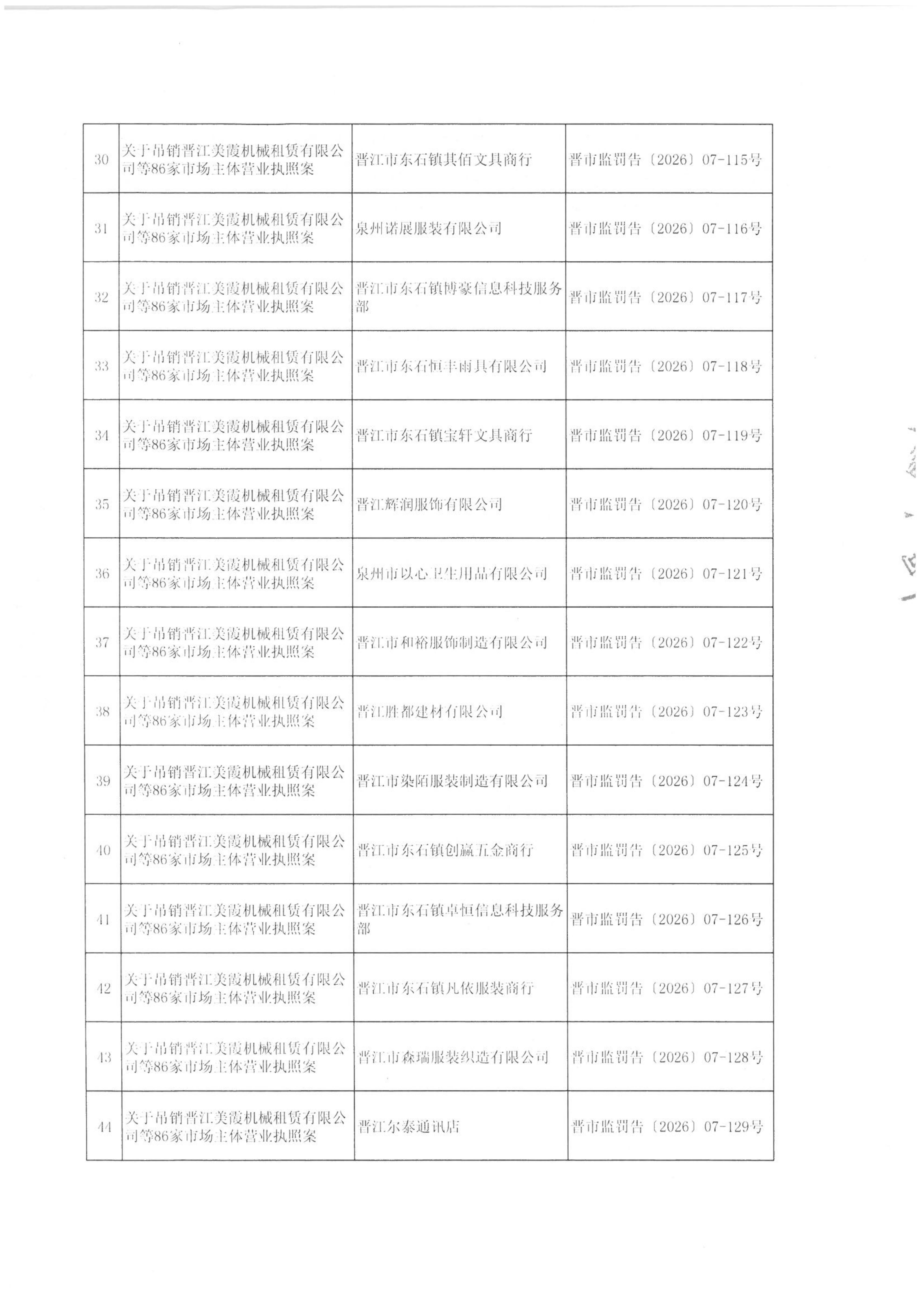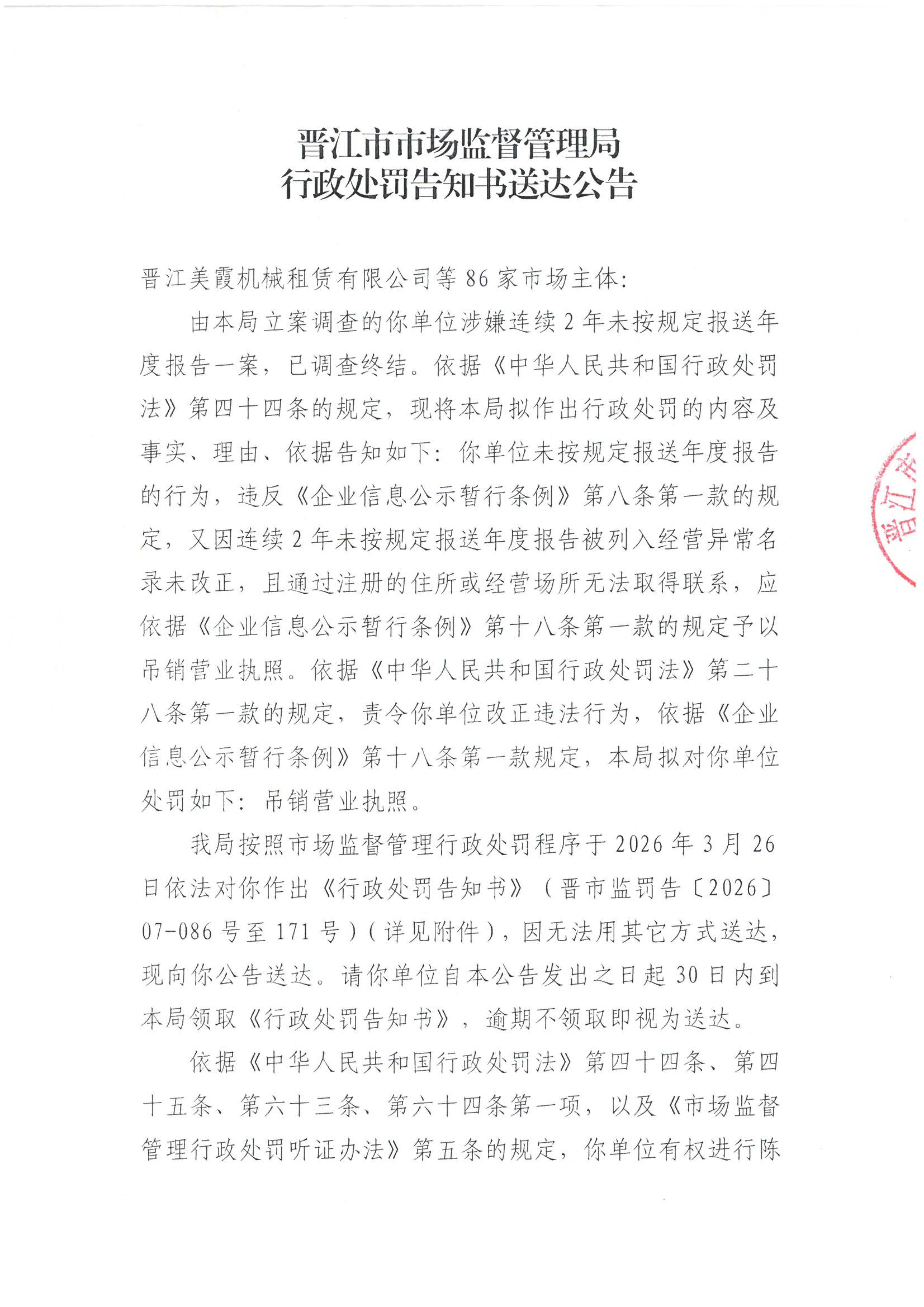晋江市市场监督管理局行政处罚告知书送达公告(晋江市美霞机械租赁有限公司等86家市场主体)