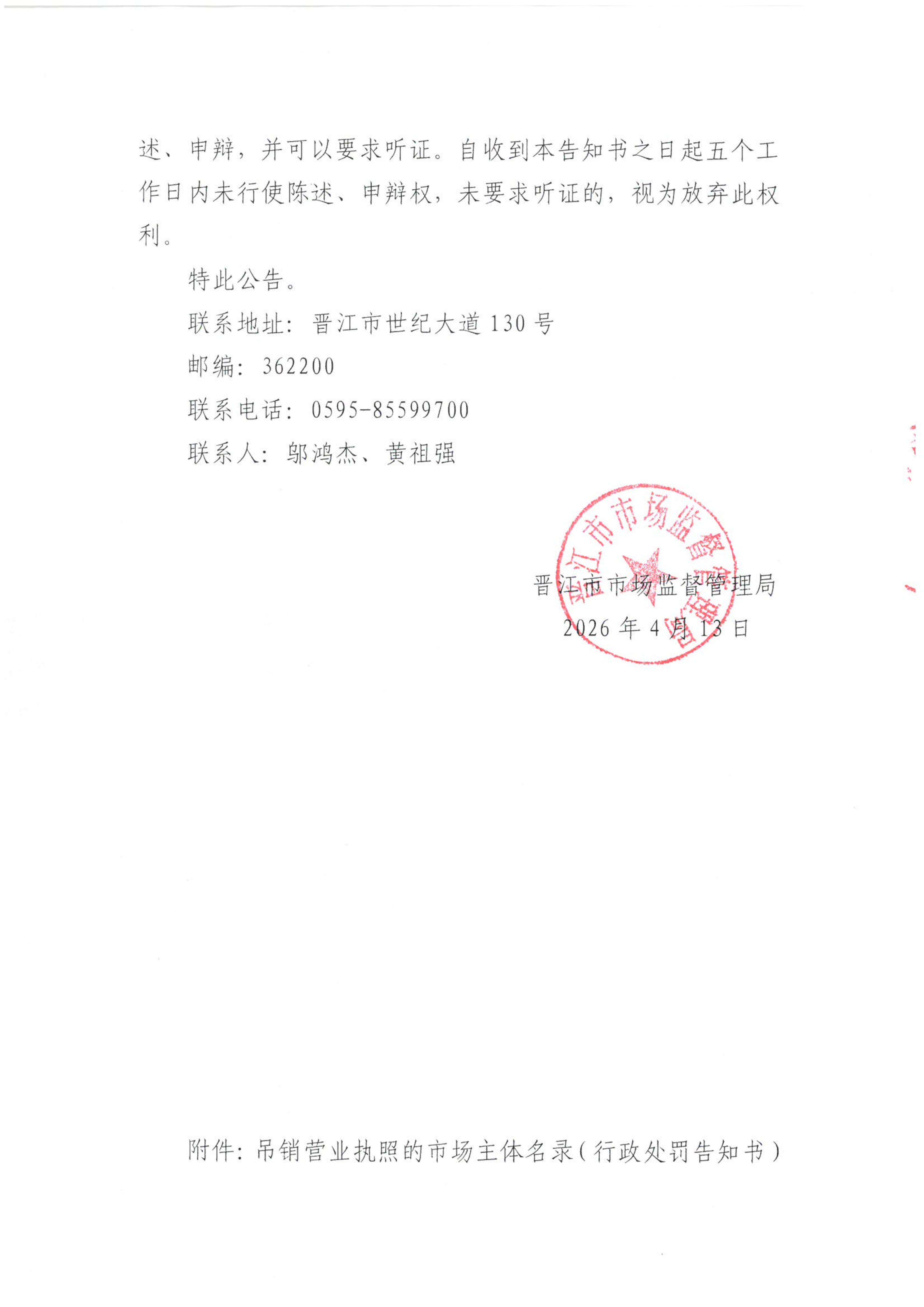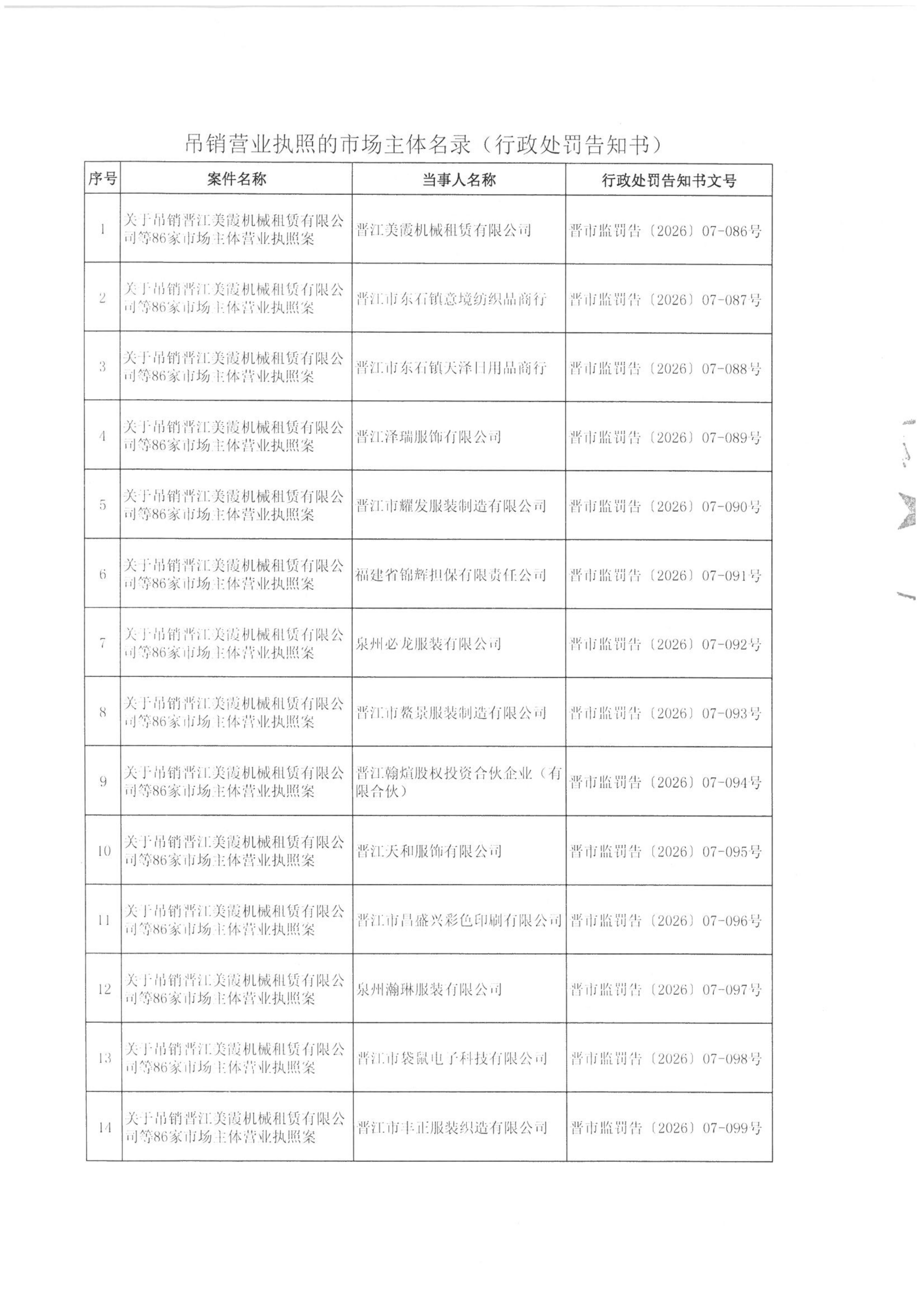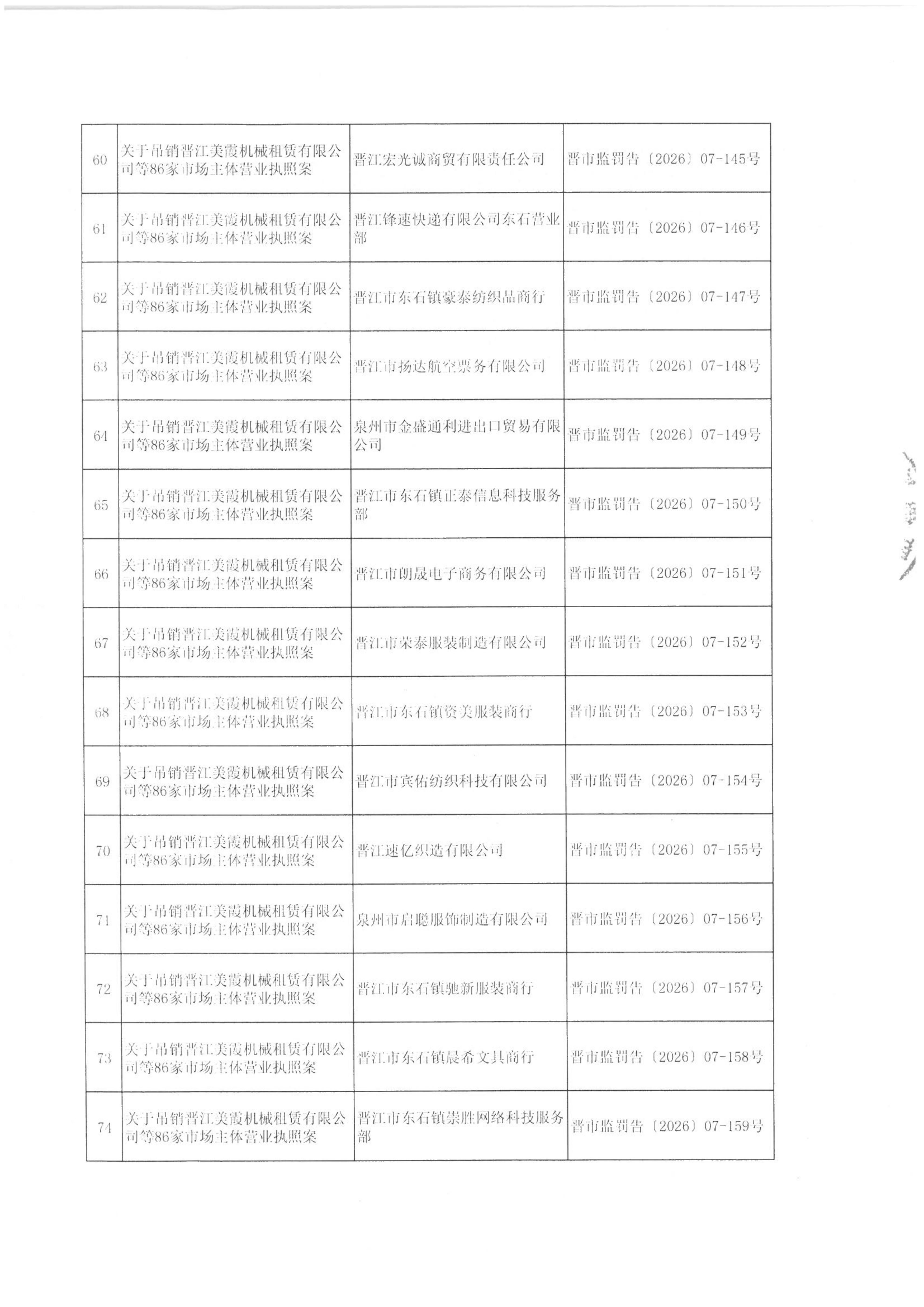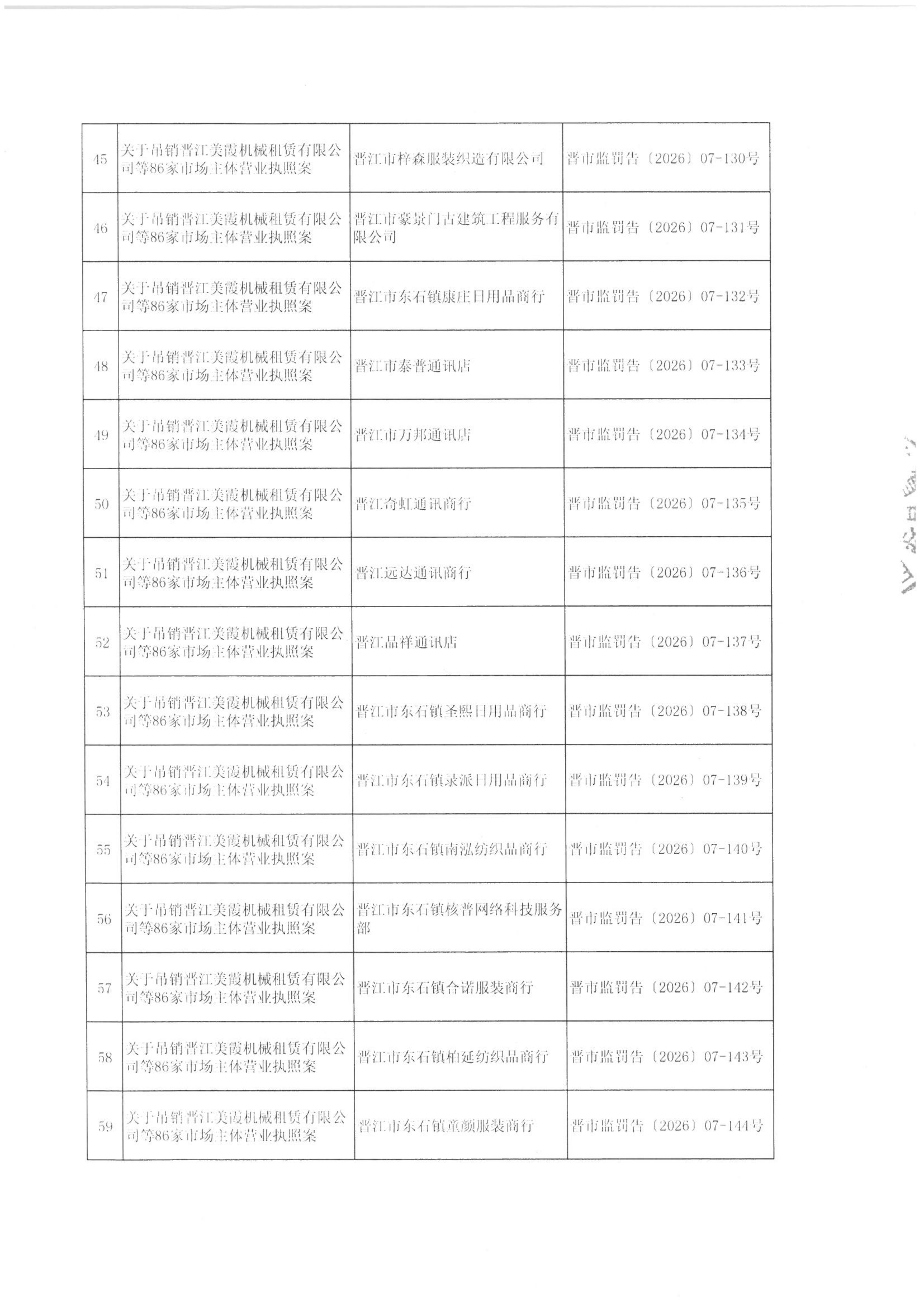 晋江市市场监督管理局行政处罚告知书送达公告(晋江市美霞机械租赁有限公司等86家市场主体)