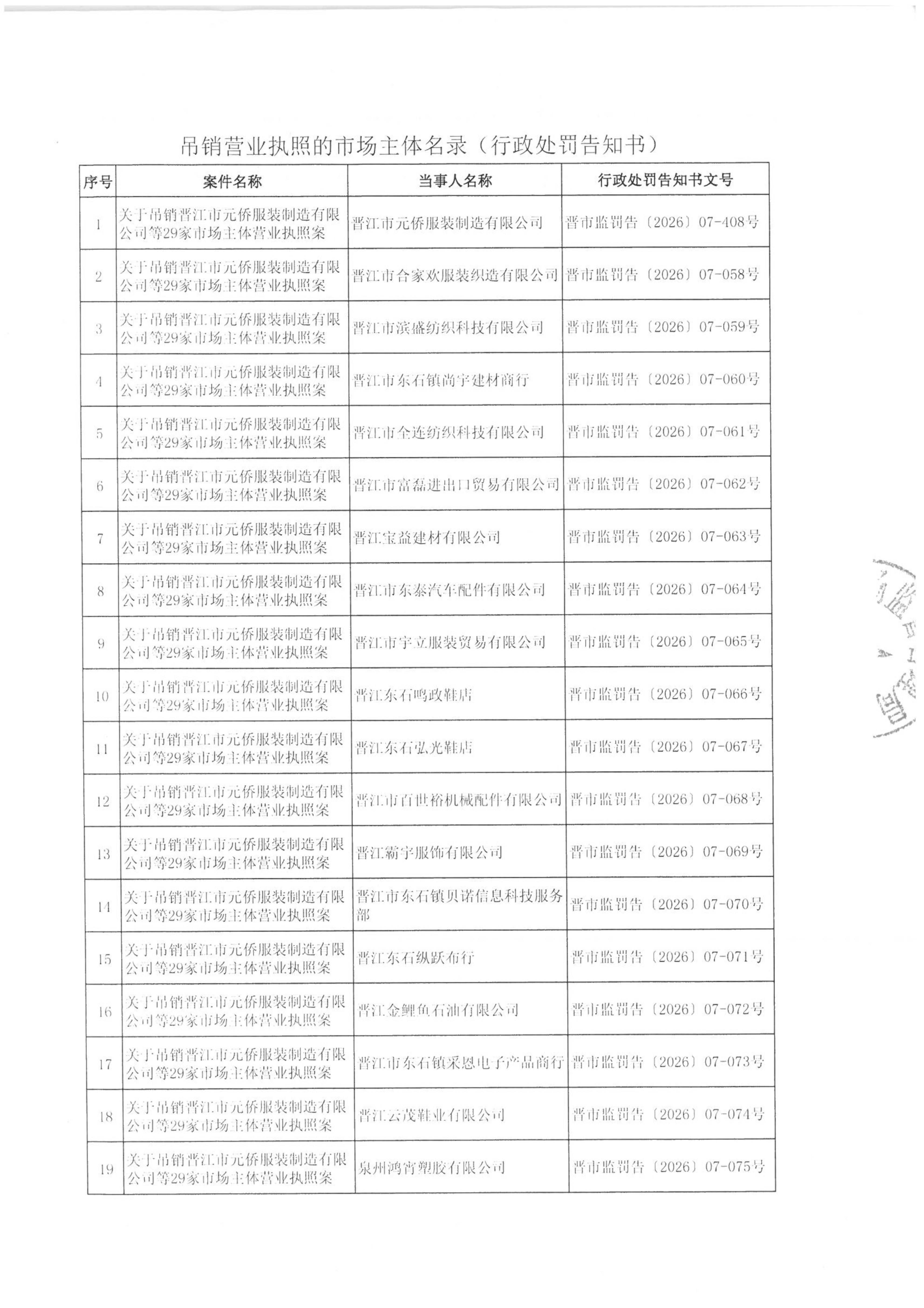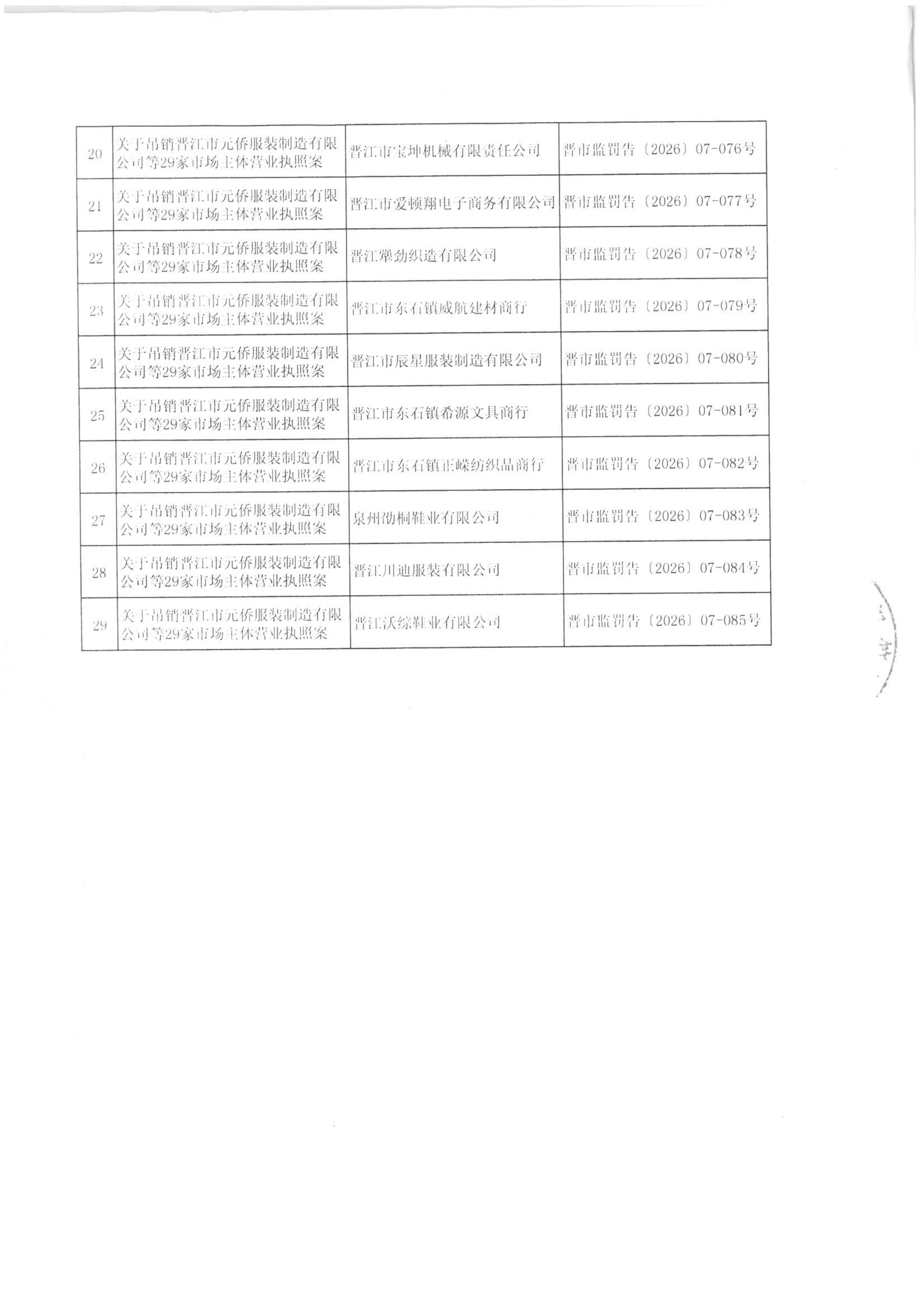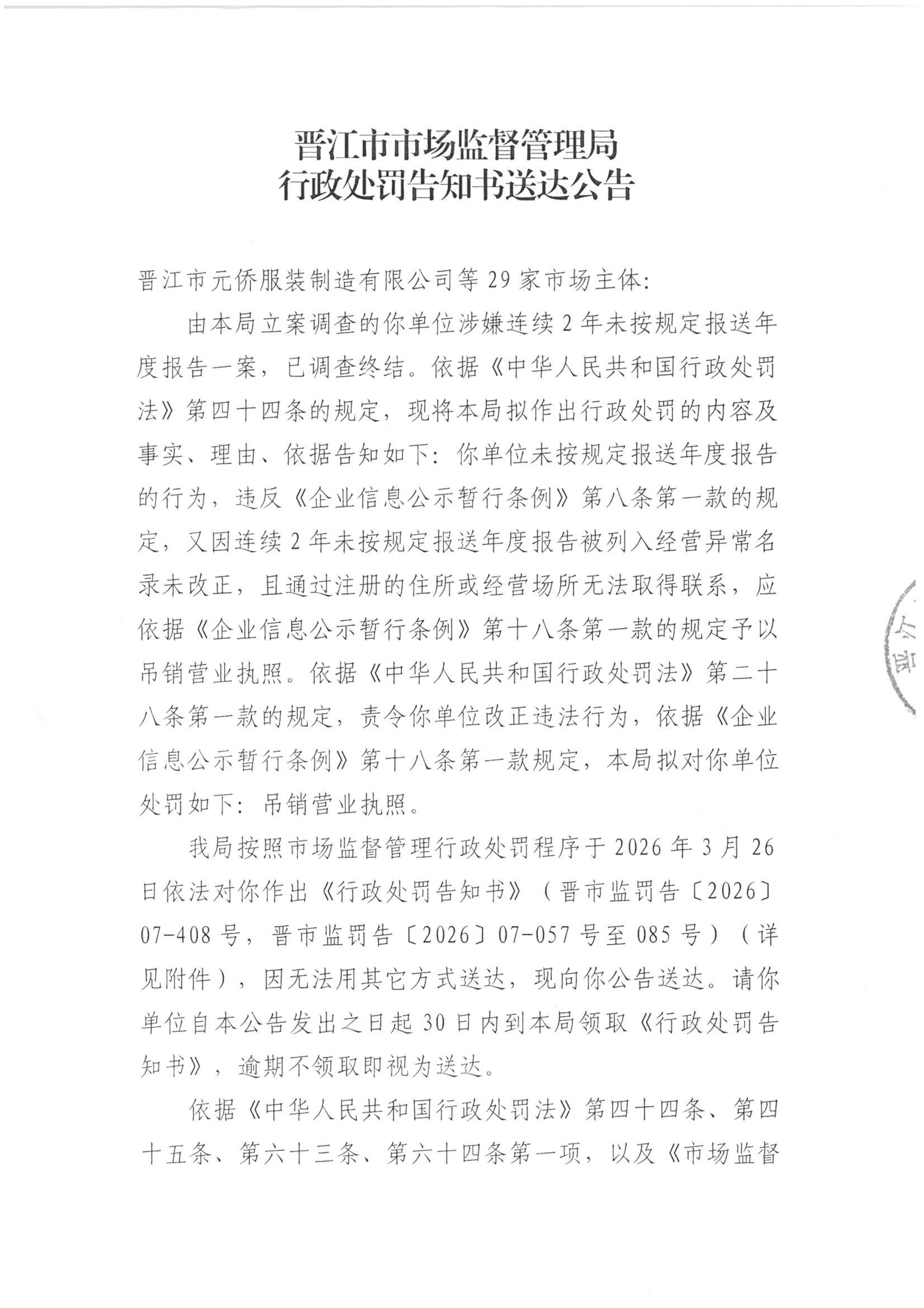晋江市市场监督管理局行政处罚告知书送达公告(晋江市元侨服务制造有限公司等29家市场主体)