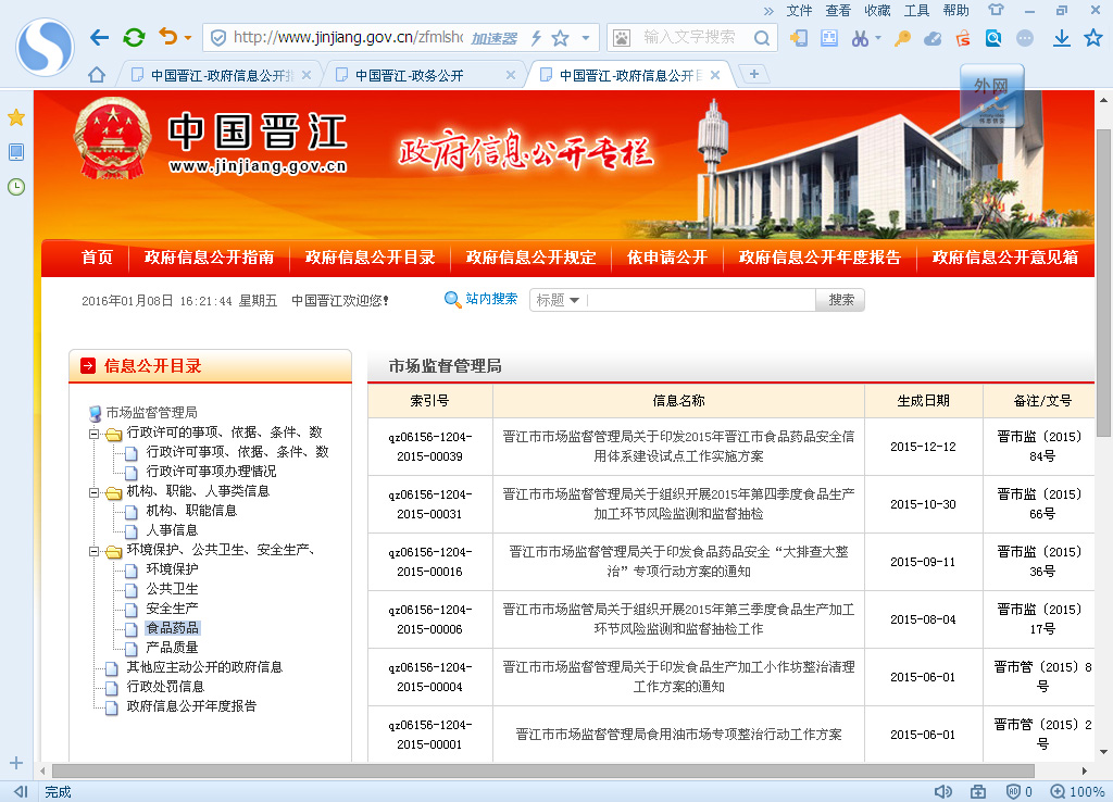 根据《中华人民共和国政府信息公开条例》(以下简称《条例》)、《福建省政府信息公开办法》(以下简称《办法》)规定,特向社会公布晋江市市场监督管理局2015年政府信息公开工作年度报告。报告包括概述、政府信息主动公开情况、政府信息依申请公开办理情况、政府信息公开的收费及减免情况、申请行政复议及提起行政诉讼情况、存在主要问题和改进措施、附表等内容。