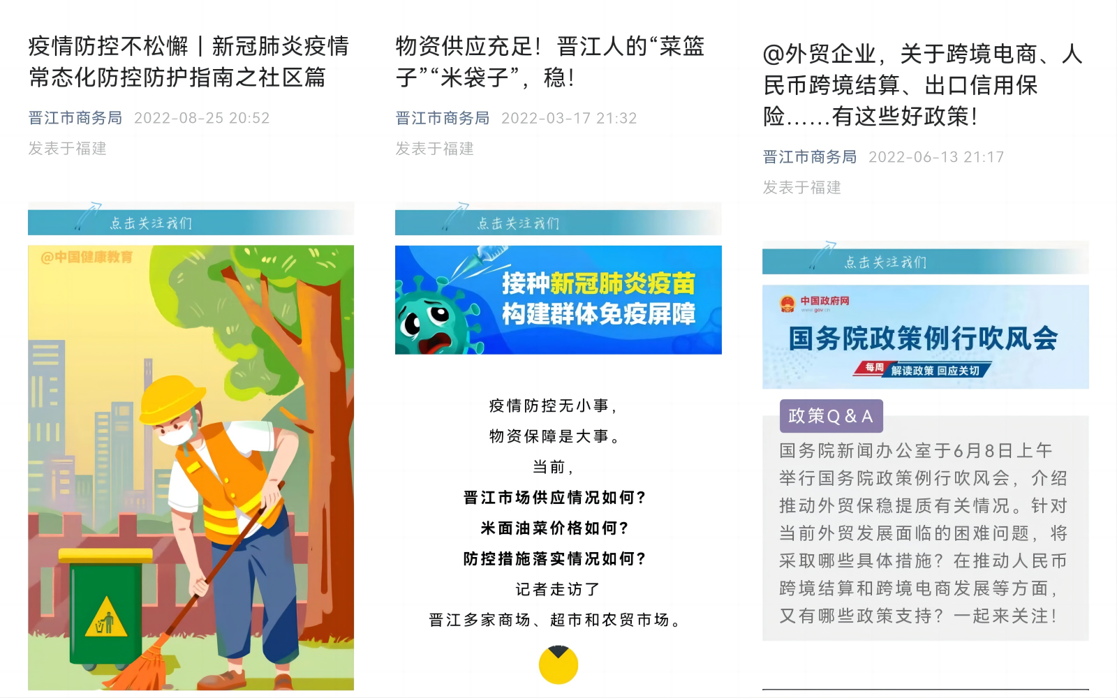 通过“晋江市商务局”微信公众号公开疫情防控、市场保供、政策解读等民生信息