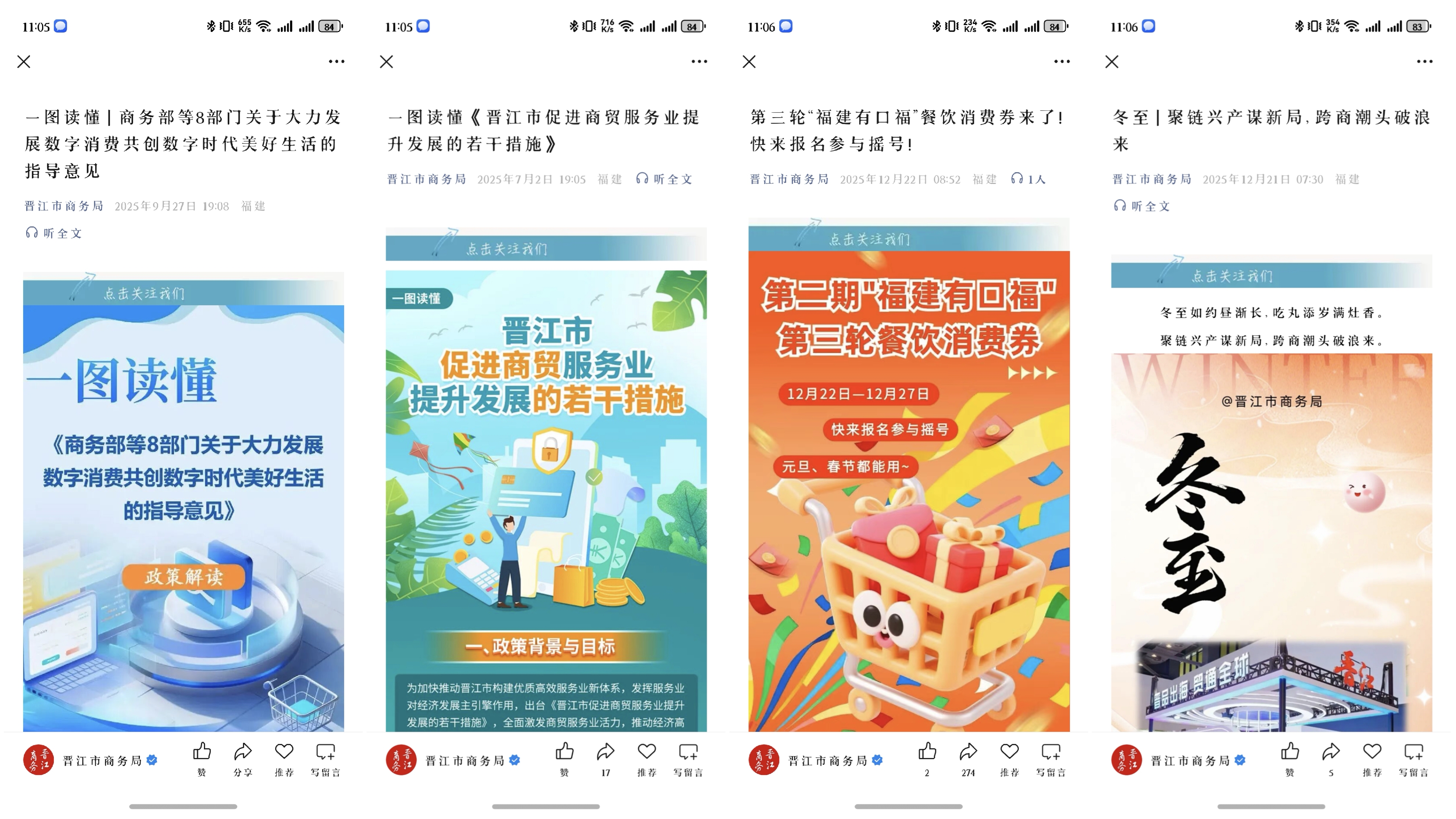 积极构建多元立体的政务公开平台体系。一是持续优化门户网站专栏,确保栏目清晰、归类准确、便于查询。二是用好政务新媒体,“晋江市商务局”微信公众号常态化发布商务动态、政策解读、服务指南等信息,全年发布信息1403条,全渠道累计阅读量达24.85万次,围绕商贸经济运行策划推出节日节气主题海报43期。三是拓展线下公开渠道,在局机关设立政务公开栏,并指导商贸综合体、农贸市场等场所开展政策宣传,进一步扩大信息公开覆盖面和影响力。