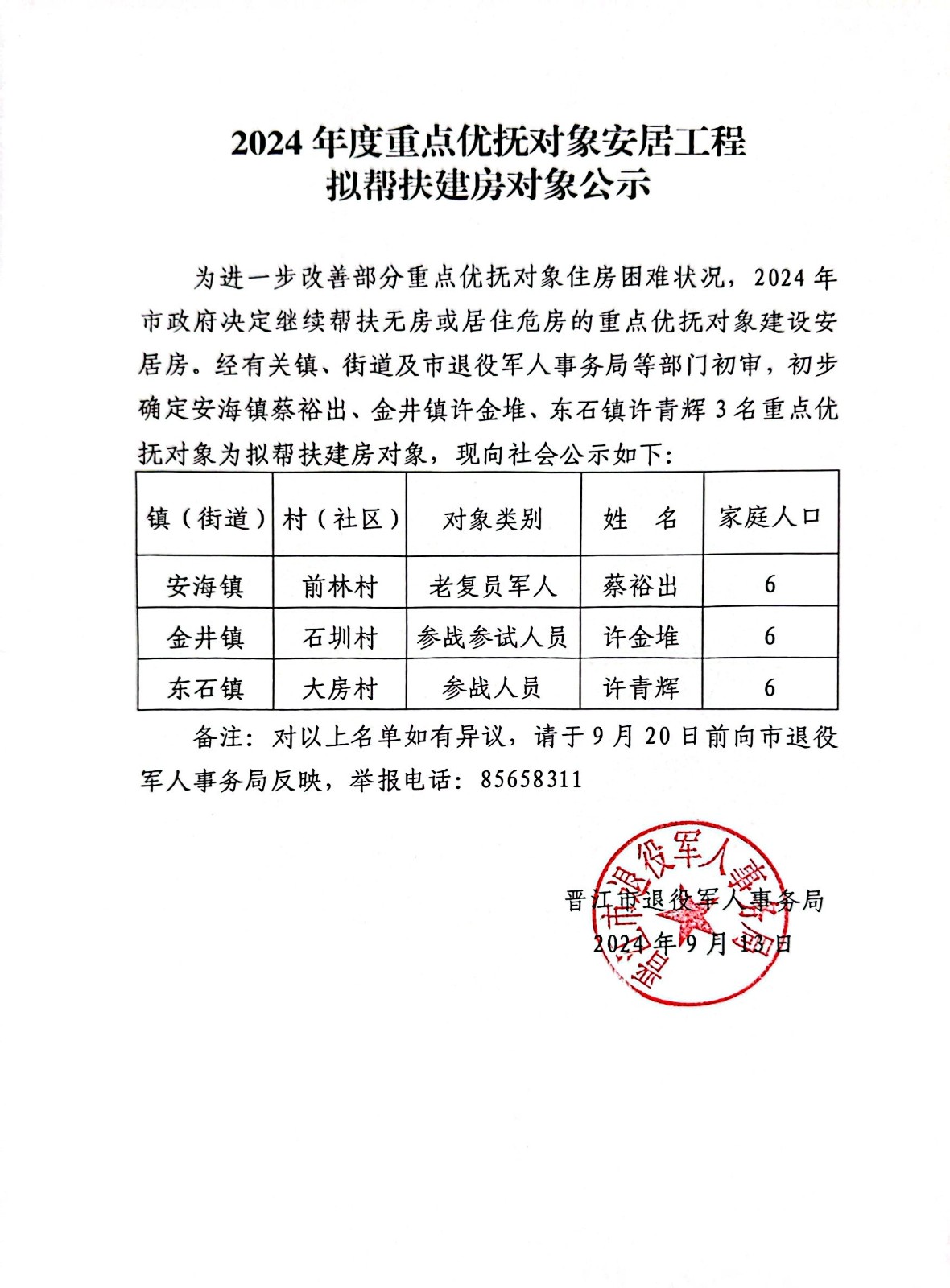 为进一步改善部分重点优抚对象住房困难状况,2024年市政府决定继续帮扶无房或居住危房的重点优抚对象建设安居房。经有关镇、街道及市退役军人事务局等部门初审,初步确定安海镇蔡裕出、金井镇许金堆、东石镇许青辉3名重点优抚对象为拟帮扶建房对象,现向社会公示如下: