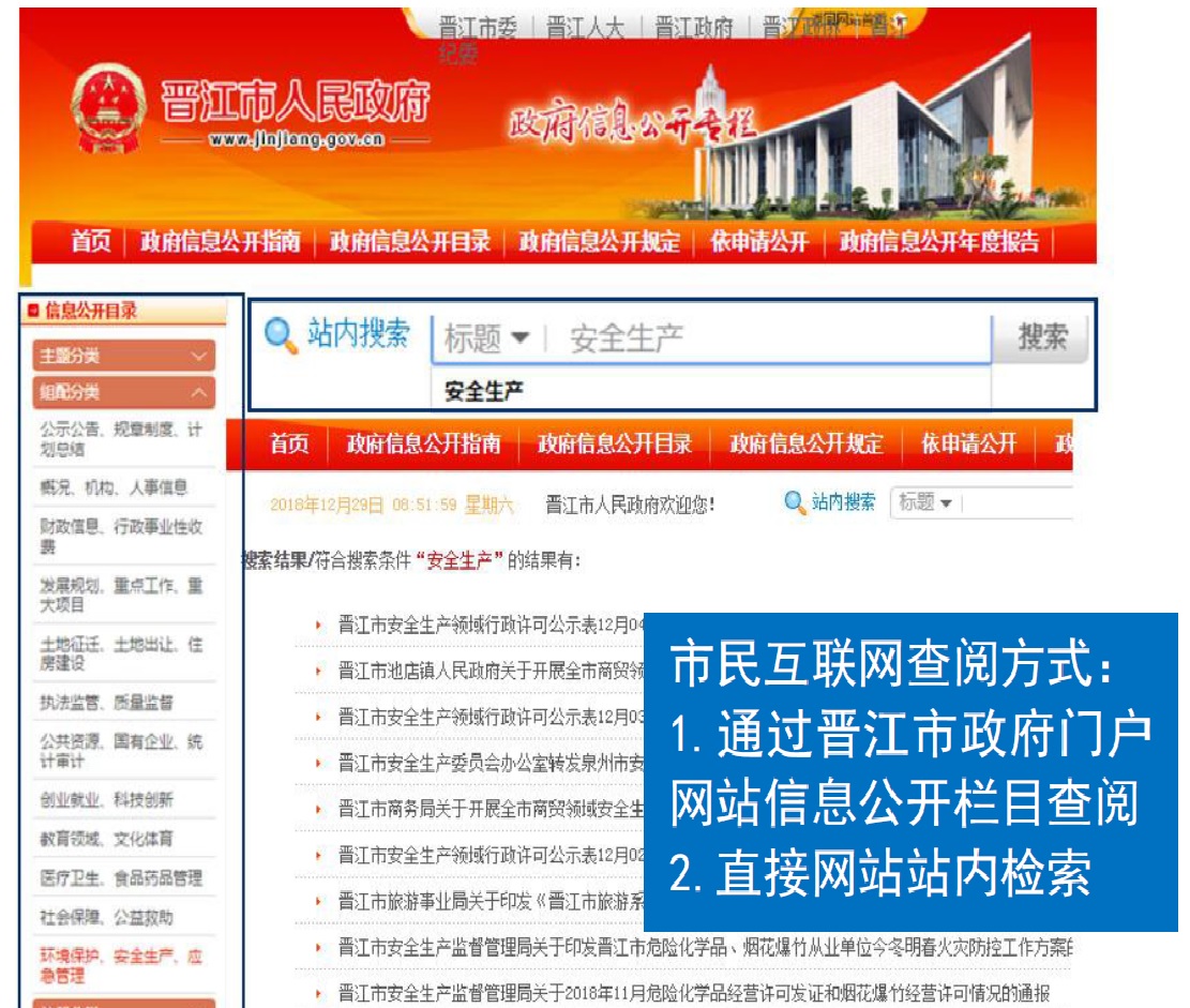 市民通过“晋江政务网”门户网站的政务信息公开专栏及其子栏目,可查阅市安监局及其市政府其他工作部门、各镇(街道)主动公开的政务信息;通过“依申请公开受理”栏目可向市安办各类政务信息公开提出公开申请,并查阅市安监局政务信息公开申请处理状态;为方便公众查阅各政府机关主动公开市安监局政务信息,门户网站实现了主动公开政务信息全文检索功能。