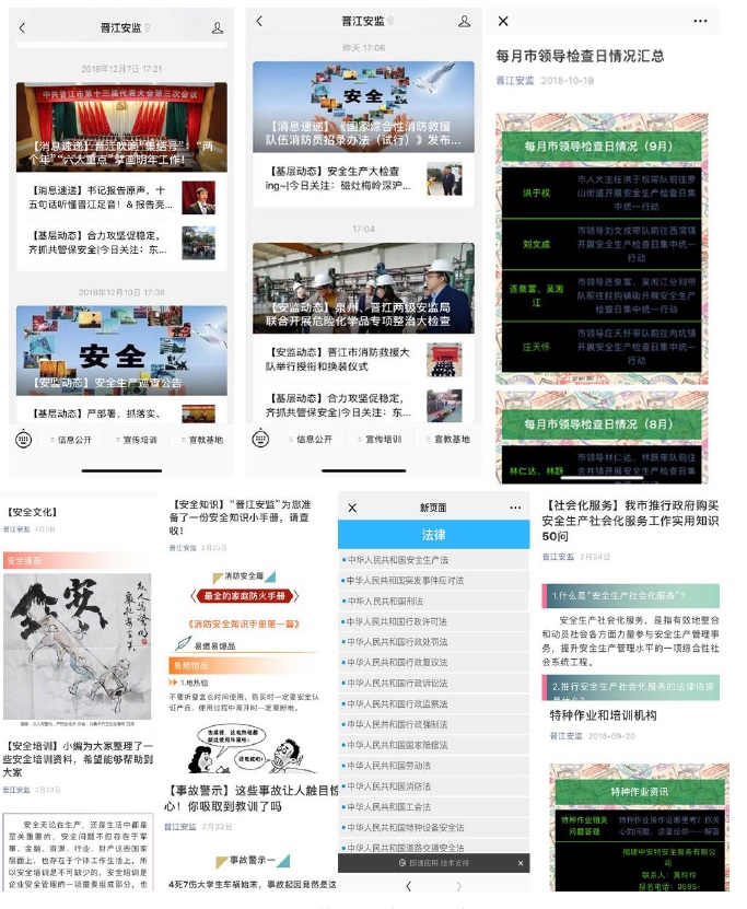 通过“晋江安监”微信公众号公开我市安全新闻、基层安全动态、政策解读和宣教培训情况,同时不定期发布安全生产知识,提高市民安全生产综合素质。2018年晋江安监微信公众号发布信息267期、795篇次,微信粉丝数稳定于4万人(同比增长了4倍多),在全国市县乡安监局公众号影响力百强排名稳步上升(平均约55名,最好的成绩为15名)