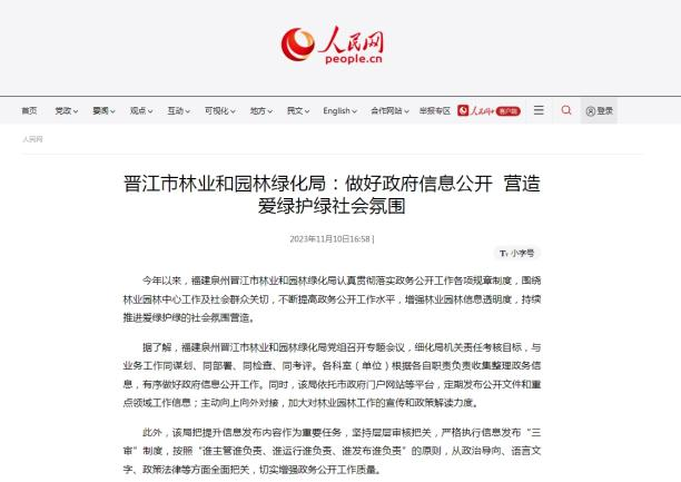 (四)政府信息公开平台建设方面。积极加强门户网站栏目和政务微信平台建设,充分运用门户网站、微信公众号、通知公告等形式,及时发布本单位公开文件、重点领域工作信息和林业园林工作动态等。一是抓好亮点推介。聚焦林业园林工作成效,编发11期晋江绿化信息,在“泉州政务”公众号发表典型工作文章3篇,及时总结推介我局工作成果和特色。二是抓好线下公开。结合“爱鸟周”、“湿地保护宣传周”、森林防火月、“全民动员、绿化晋江”、主题党日等活动,深入村社、林区、公园等开展野生动植物保护、湿地保护、森林防火、植树造林以及林地林木权属等政策法规宣传,发放宣传材料10000余份,进一步提高群众参与感,有效增强群众对政策法规的支持和理解。三是抓好媒体宣传。协同人民网、泉州晚报、晋江经济报、晋江新闻网等媒体,加大对造林绿化、公园建设、生物多样性保护等工作的宣传报道,进一步扩大、细化林业园林信息宣传的范围和内容,增强信息公开的时效性和影响力。积极向省级以上媒体推送信息,生物多样性保护工作屡次被央视媒体报道。