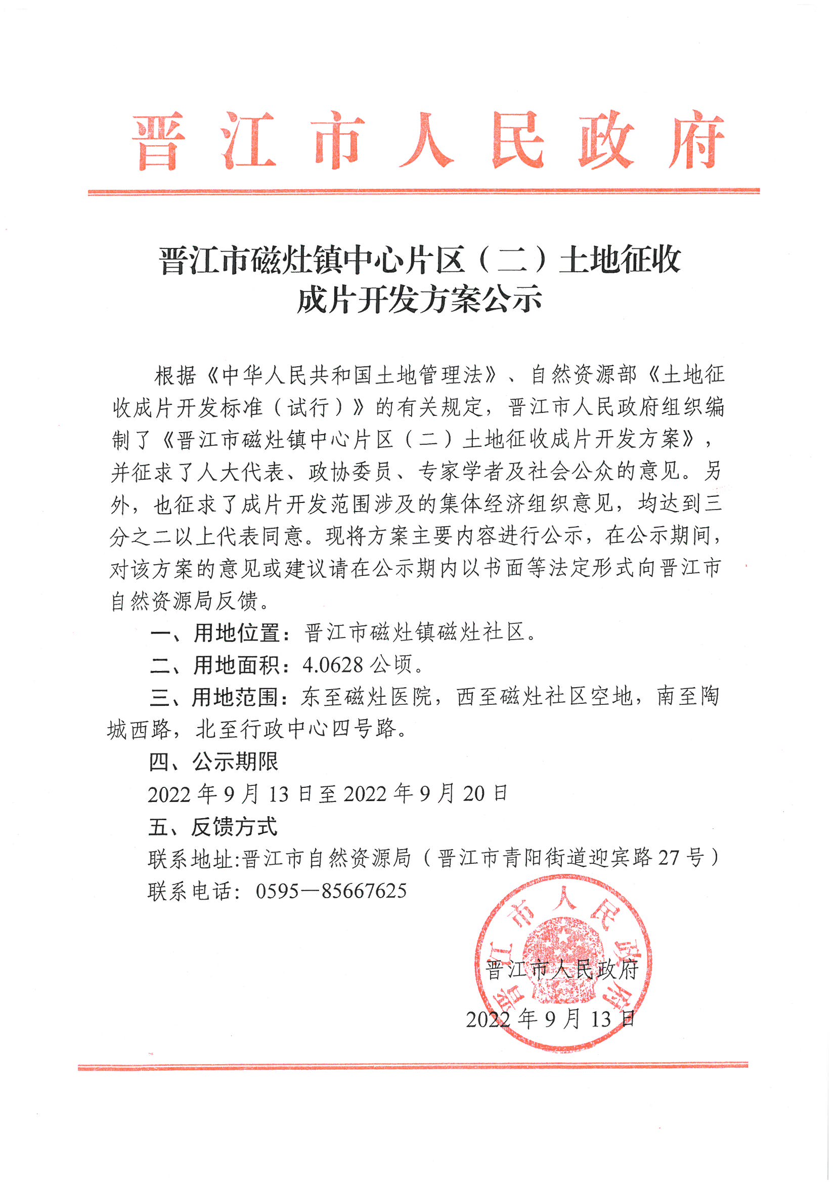 晋江市磁灶镇中心片区(二)土地征收成片开发方案公示