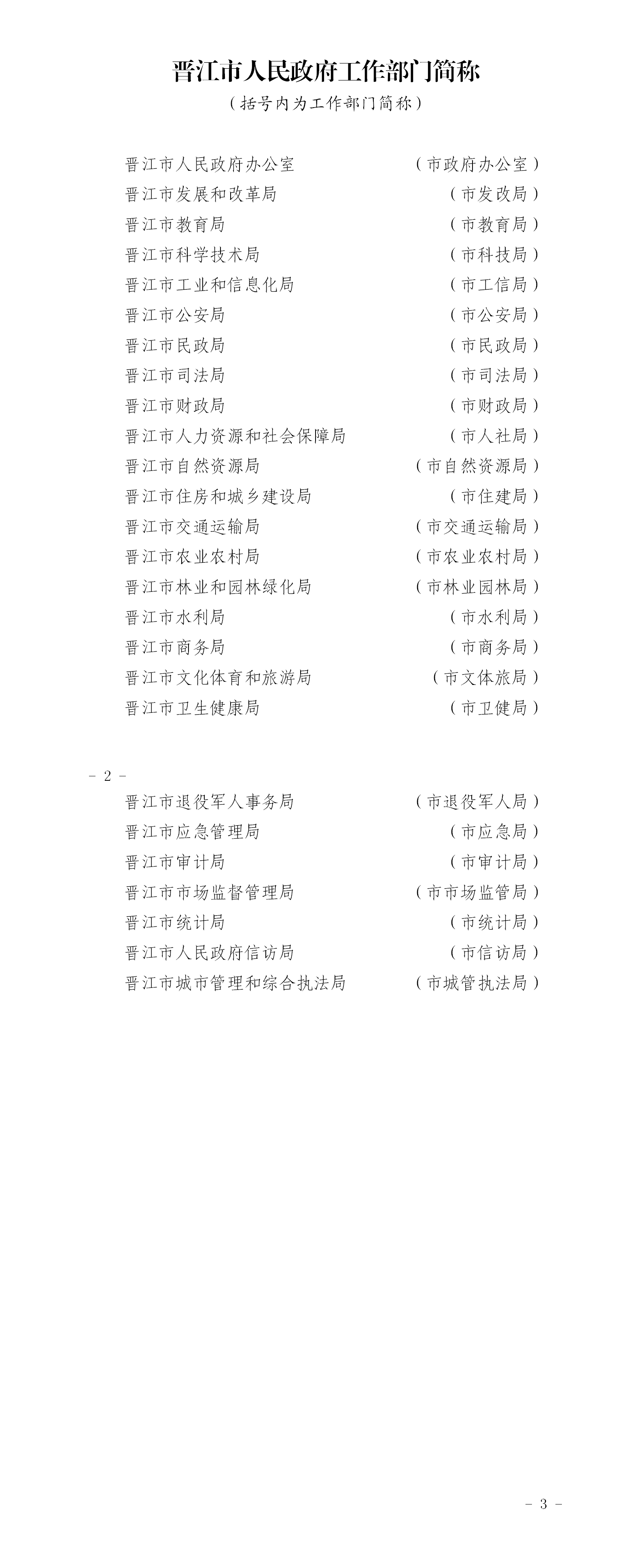 晋江市人民政府办公室关于印发晋江市人民政府工作部门简称的通知