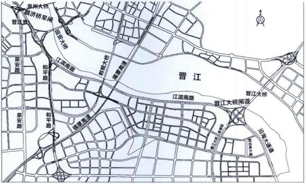 江滨南路(晋江段):北自顺济桥旱闸往东晋江界起点,南至晋江大桥互通右转匝道,路线全长6.4公里,道路标准横断面宽度为50米,部分路段为37米、42米等不同宽度,道路等级为晋江城市主干路。