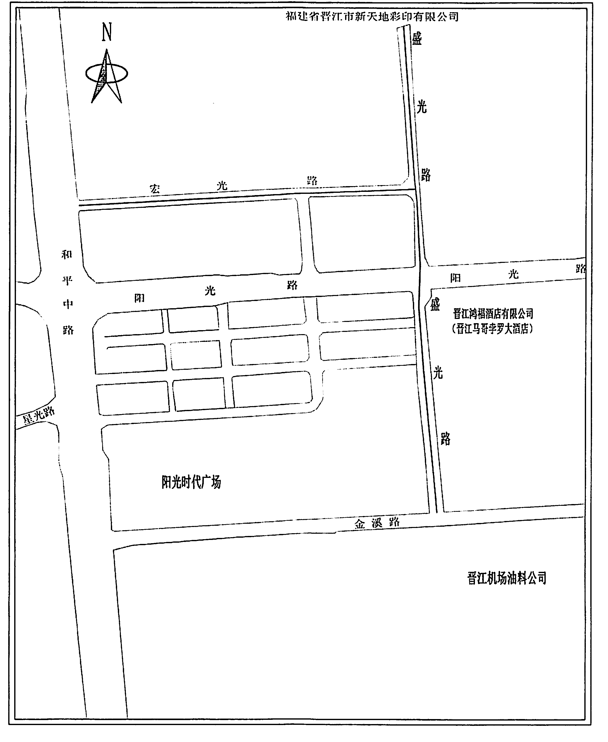 二、盛光路:北起福建省晋江市新天地彩印有限公司,途经宏光路、阳光路、晋江鸿福酒店有限公司(晋江马哥孛罗大酒店),南至金溪路,总长约461米、宽12米。