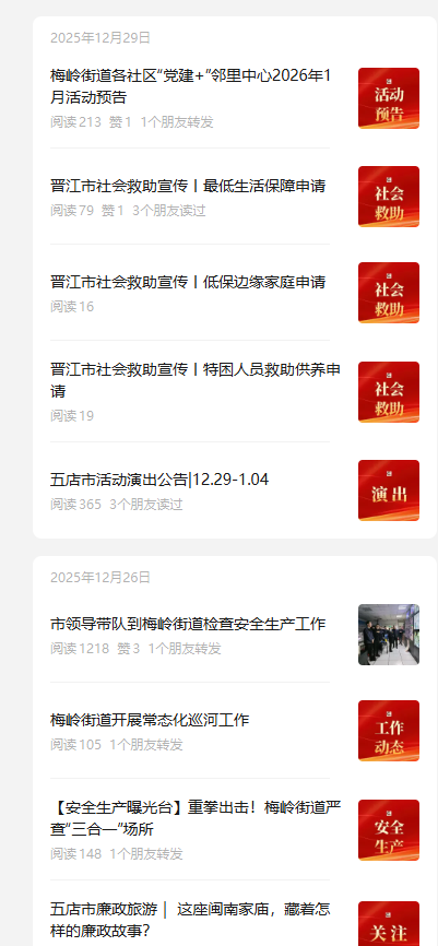 依托街道微信公众号“梅岭FAN”发布信息1307条,重点围绕文明城市创建、安全生产、重点工作部署、惠民政策宣传、活动动态、经验总结等内容推送,进一步畅通群众获取信息渠道,提升政务公开覆盖面与到达率。