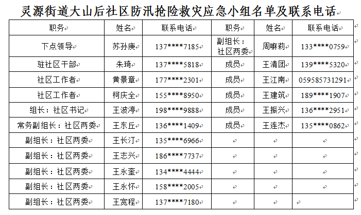 应急小组成员名单及联系方式见下表:
