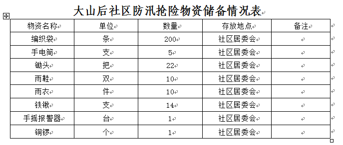 居委会共储备了编织袋,手电筒,锄头,雨鞋,雨衣等防汛抢险物资(具体详见下表)。