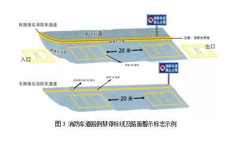 1.在消防车道路侧缘石立面和顶面应当施划黄色禁止停车标线;无缘石的道路应当在路面上施划禁止停车标线,标线为黄色单实线,距路面边缘30厘米,线宽15厘米;消防车道沿途每隔20米距离在路面中央施划黄色方框线,在方框内沿行车方向标注内容为“消防车道禁止占用”的警示字样。(如图3所示)。