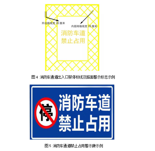 2.在单位或者住宅区的消防车道出入口路面,按照消防车道净宽施划禁停标线,标线为黄色网状实线,外边框线宽20厘米,内部网格线宽10厘米,内部网格线与外边框夹角45度,标线中央位置沿行车方向标注内容为“消防车道 禁止占用”的警示字样;在消防车道两侧设置醒目的警示标牌,提示严禁占用消防车道,违者将承担相应法律责任等内容。(如图4、图5所示)