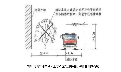 (三)消防车道宽度和高度不小于4米,与建筑之间不得设置妨碍消防车举高操作的树木、架空管线、广告牌、装饰物、限高杆等障碍物。(如图6所示)