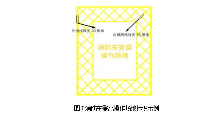 (六)建筑管理单位应按照高层建筑原审批合格时的设计图纸的消防车登高操作场地长度和宽度标识出禁止占用的区域范围,施划禁停标线,标线为黄色网状实线(如图7所示)。