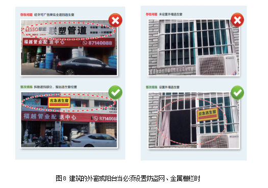 1.建筑外墙、外窗或阳台不得设置妨碍人员逃生、灭火救援和防烟排烟的固定防盗网、金属栅栏、广告牌、灯箱等障碍物。