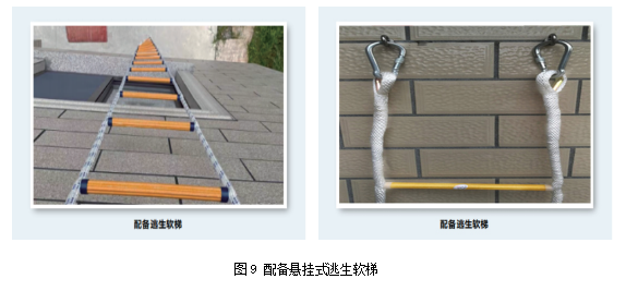 4.悬挂式逃生软梯一般配备在不高于15米的楼层内,使用方法为:将逃生软梯一端固定在窗台或其他固定物上,另一端放至地面,顺软梯向下逃生。(如图9所示)