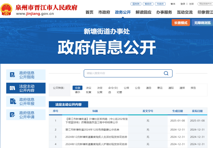 通过泉州市晋江市人民政府门户网站(http://www.jinjiang.gov.cn)的政务公开专栏主动公开政府信息。同时在“新塘芯起航”微信公众号定期发布便民信息、工作动态。2024年利用“新塘芯起航”微信公众号发布信息1309篇,其中原创阅读量370062次。