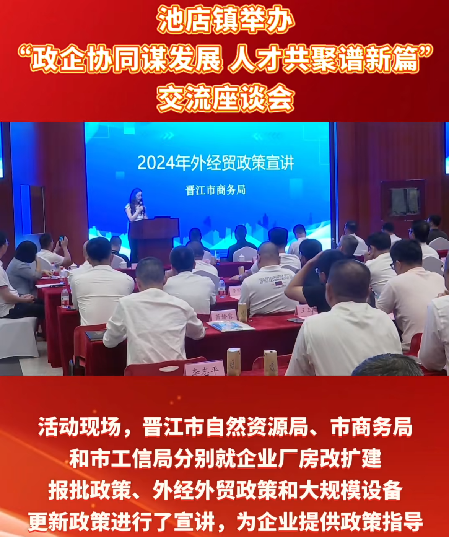 2024年2月22日、11月8日,池店镇召开企业创新发展暨党政商新春座谈会和“政企协同谋发展 人才共聚谱新篇”交流座谈会,会上解读集体土地入市、园区标准化项目招商扶持、企业厂房改扩建报批、外经外贸、大规模设备更新等政策。开展惠企政策宣讲会4次,利用“池店在线”公众号多次转发惠企政策解读。此外,池店镇深入开展“千名干部进千企”活动,领导干部不定期走访包村辖区行业,协调解决企业发展困难和问题183个。