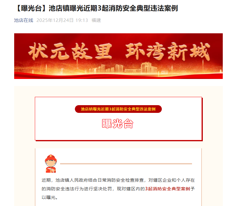 4.安全生产和隐患整治情况信息公开。加强清明节祭扫、“生三合一”场所消防安全、企业全员安全生产、工矿商贸行业领域安全生产、防汛防台等应急预案和行动方案公开,提高突发情况信息发布时效性。加强安全生产、消防安全、谨防诈骗等知识宣传,创建平安池店。开展安全生产及消防安全的宣教“五进”活动,入村宣讲4场、入企宣讲6场、入校宣讲5场、开展企业消防演练9场,参训人员达3000余人次,发放各类宣传手册7000余份。联合交警开展交通安全宣讲活动,设立“交通安全劝导点”,依托“池店在线”微信公众号、村(社区)微信群等平台,定期曝光典型违法案例,切实提高群众社会安全意识,强化交通安全宣传。