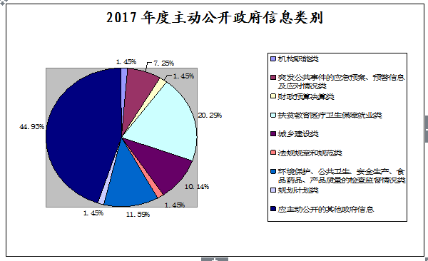 2017年各级政府及其工作部门主动公开政府信息的主要类别有:机构职能类信息1条,占1.45%;法规规章和规范类信息1条,占1.45%;财政预算决算类信息1条,占1.45%;突发公共事件的应急预案、预警信息及应对情况类信息5条,占7.25%;扶贫、教育、医疗、卫生保障、促进就业等方面的政策、措施及其实施情况类信息14条,占20.29%;城乡建设类信息7条,占10.14%;环境保护、公共卫生、安全生产、食品药品、产品质量的检查监督情况类信息8条,占11.59%;规划计划类信息1条,占1.45%;应主动公开的其他政府信息31条,占44.93%。