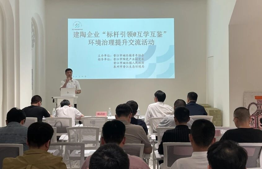 2025年4月28日,在磁灶镇青年协会举办了建陶企业“标杆引领 互学互鉴”环境治理提升交流活动。此次培训共有20余家企业代表参加。会上,晋江生态环境局工作人员现场进行政策宣讲、答疑解惑,帮助企业明差距、补短板、促提升,推动建陶产业绿色低碳高质量发展。除此之外,磁灶镇