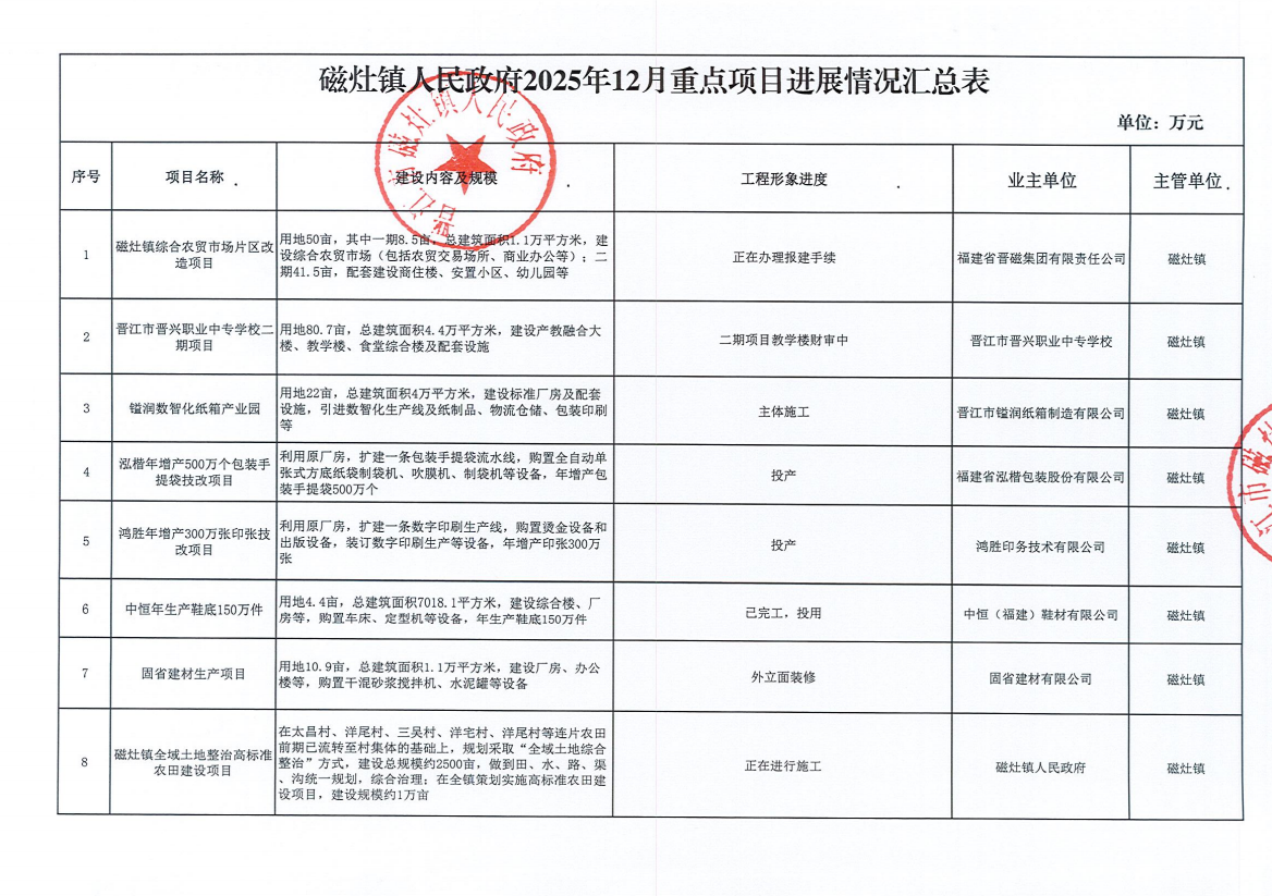及时做好重大建设项目信息公开。积极引导市场预期,每个月在晋江市人民政府网“重点领域信息公开”专栏公开重大建设项目信息,公开内容包括:项目名称、建设内容及规模、工程形象进度、业主单位、主管单位等内容。