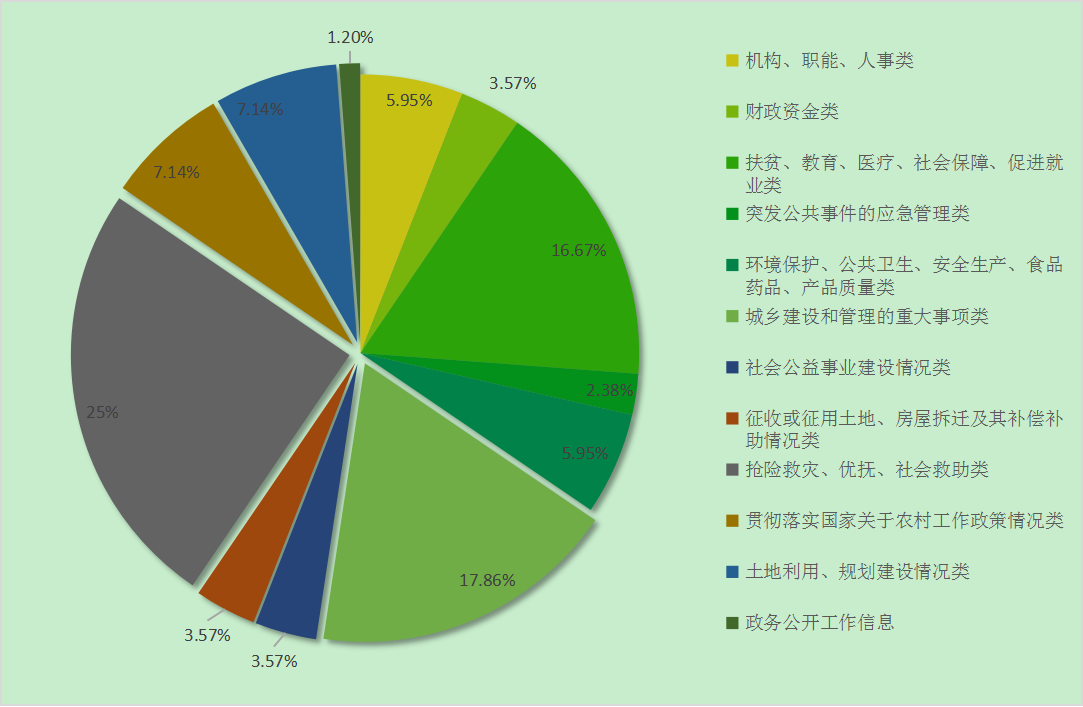 2022年,我镇严格按照文件公开属性审查制度草拟公文并明确公开属性,对其进行目录汇总、归类、存档,拟公开材料通过政府信息门户网站主动公开信息。全年我镇在信息公开平台上累计主动公开信息84条,全文电子化率100%。其中机构、职能、人事类信息5条,占5.95%;财政资金类3条,占3.57%;扶贫、教育、医疗、社会保障、促进就业类14条,占16.67%;突发公共事件的应急管理2条,占2.38%;环境保护、公共卫生、安全生产、食品药品、产品质量类5条,占5.95%;城乡建设和管理的重大事项类15条,占17.86%;社会公益事业建设情况类3条,占3.57%;征收或征用土地、房屋拆迁及其补偿补助情况类3条,占3.57%;抢险救灾、优抚、社会救助类21条,占25%;贯彻落实国家关于农村工作政策情况类6条,占7.14%;土地利用、规划建设情况类6条,占7.14%;政务公开工作信息1条,占1.2%。