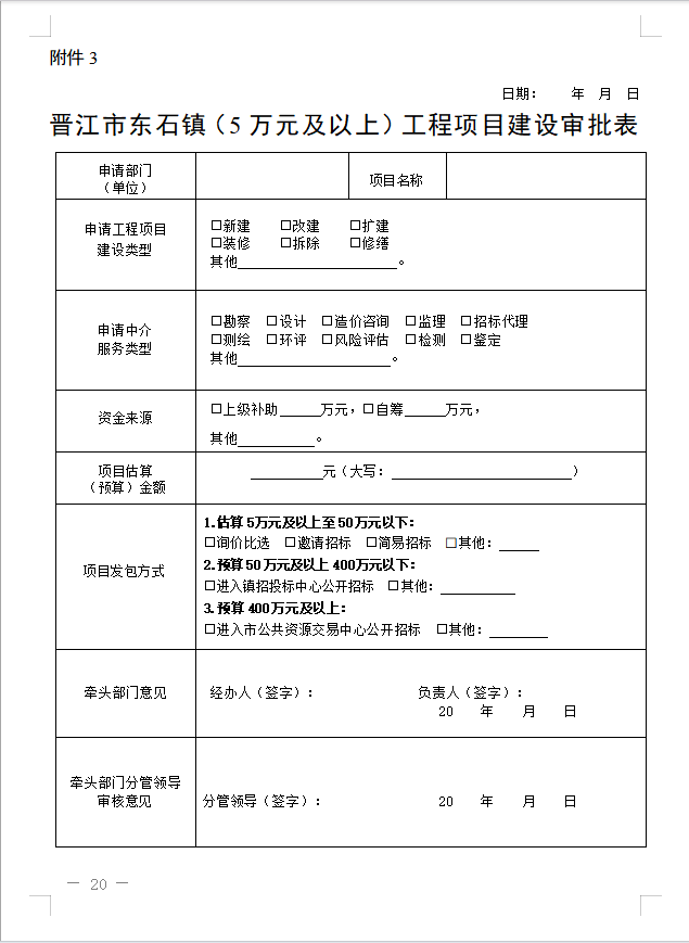 (2)5万及以上至50万元(不含)以下的工程项目。由各项目牵头部门填写《晋江市东石镇(5万元及以上)工程项目建设审批表》(附件3),落实资金来源后,经项目牵头部门负责人、分管领导审核后,其发包方式需经党委会议集体研究(参考附件4)同意后方可实施,其发包可采用询价比选(不少于3家)或邀请招标或简易招标的方式确定承包人。其中20万以上的项目应实施工程预算和审核。