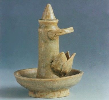 灯盏灯座呈碗状,为敞口浅弧腹,厚假圈足。座盘中心立一圆柱状实心灯柱,上端收成锥形,近柱端附一单环,柱根一侧饰三朵莲瓣。施青釉,釉不及底,底足露胎。盘口径9.2厘米、底径5.4厘米、通高12.3厘米。96霞福唐墓出土。