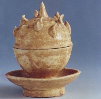 博山炉炉身和炉盖都作半球形,子母口,扣合成球形。盖面堆贴二层火焰升腾状角,每层五角,盖顶饰一尖柱钮,四周镂四孔。炉身与底盘相连。托盘敞口、浅腹,假圈足。通体施青黄釉,器内不施釉,釉部分脱落。盖口径7.8厘米、炉身口径7.8厘米、盘口径8.8厘米、底径5.8厘米、通高12.6厘米。96霞福唐墓出土。