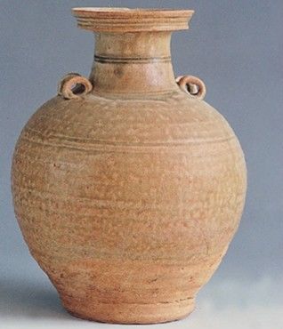 盘口壶盘口,短束颈,溜肩,圆鼓腹下收及底,平底。口沿下、颈部和肩部饰有8道弦纹,肩部附对称的四桥形耳。施青黄釉,釉层肥厚,光泽晶莹,呈细碎开片;外釉不及底,内釉仅施至颈部,釉色部分脱落。通高34厘米、口径15厘米、底径12厘米。97赤塘隋墓出土。