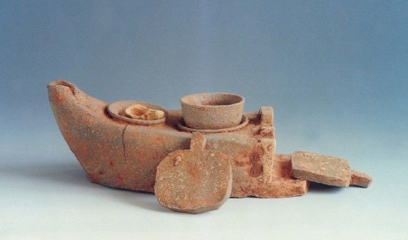 陶灶呈船型,前开一鸡心形出烟孔,后设挡火墙,上置两釜,一釜上置一勺,另一釜上置甑,挡火墙下开一圆拱形灶门,前置有“凸”字形挡火板2件。夹砂灰陶质。灶长23厘米、高8.8厘米、宽11厘米;甑口径5.8厘米、高4.3厘米。96赤塘唐墓出土。