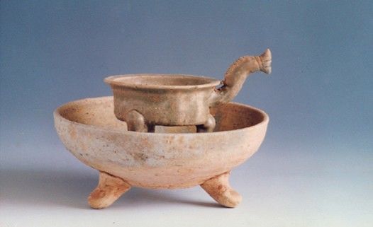 三足陶盆托鐎斗由陶盆和鐎斗组成,鐎斗置于陶盆内。陶盆口微敛,斜弧腹,平底,附三蹄足。素胎陶质。鐎斗敞口,口沿外折,直壁,深腹,下附三蹄足,腹一侧饰有鱼形把。通体施青黄釉。96霞福唐墓出土。
