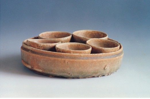 五盅盘敞口,浅腹,平底,底心微凹。盘内粘烧五个小盅;盅直口,略高于盘口,弧腹,平底。通体施青黄釉,底露胎,釉部分脱落。96霞福唐墓出土。