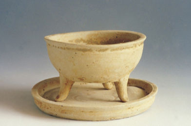 托盘三足炉由三足炉和托盘组合。三足炉作敞口,折沿,弧壁,深腹,外平底,内底略凸,有三个支烧点,底附外撇三蹄足。口沿下饰有一道弦纹。承炉的托盘敞口,直壁、平底。内底留有旋纹二道。施青黄釉,炉底和盘底露胎,釉多已脱落。